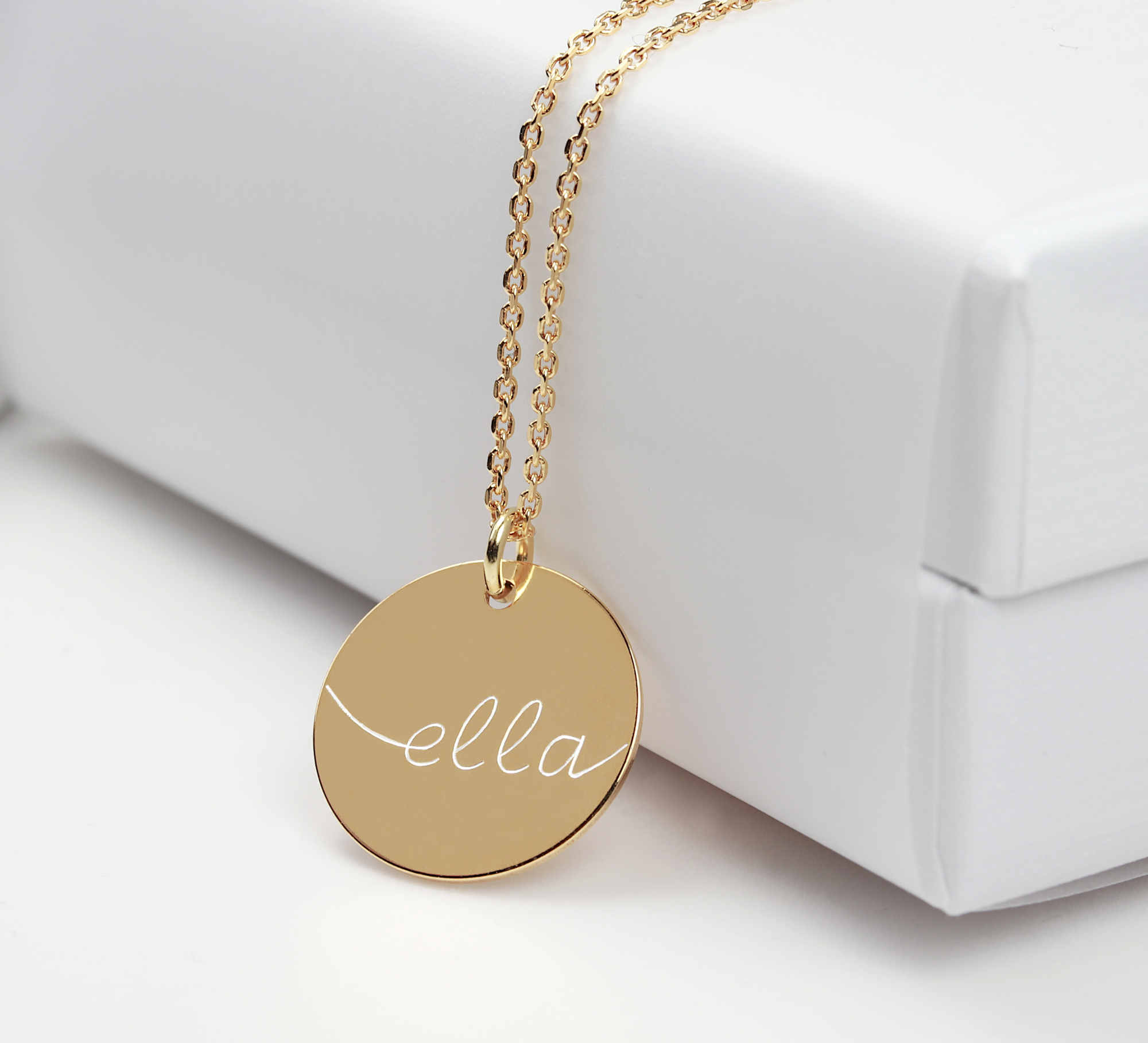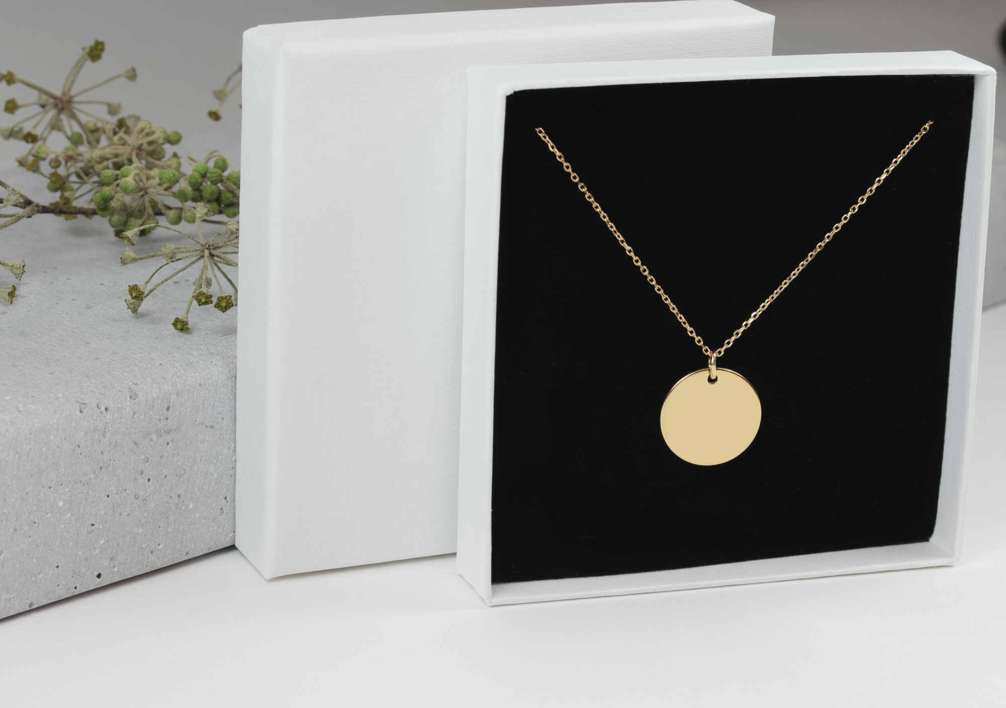 Feine Gliederkette aus 925 Silber vergoldet mit einem runden Gravur Anhänger, der mit einer zierlichen Wunschgravur verziert wird.Wenn du einen Namen, ein Datum, eine individuelle Botschaft oder die Initialen als individuelle Gravur dir wünschst, dann einfach alles ins Feld "Gravur" eingeben.Ein schöne Geschenkidee, die bestimmt eine positive Überraschung verschaffen wird. Einfach einen kleinen Hinweis, falls du ein andres Design, als auf dem Foto, haben möchtest.Als Gravur sind noch Sonderzeichen wie ein kleines Herz oder ein kleines Sternchen möglich. ♡ Gravur-Stil -> super zartes und elegantes Gravur-Design ♡ *Bitte bedenken Sie, dass wir gravierte Produkte nicht umtauschen können!Dieses Schmuckstück wird für dich auf Bestellung gefertigt.Ein besonderes Geschenk für deine Mutter, besten Freunde oder Geschwister. Größe/Maße: Gliederkette ca. 1,4 mm breit Länge: 55 cm Plättchen Anhänger : Ø 15 mm Verwendete Materialien Kette und Anhänger: 925 Silber vergoldet Kostenlose Geschenkverpackung und persönliche Geschenknachricht Jedes Schmuckstück wird in einer weißen Geschenkbox verpackt. Zur Verfügung stehen eine Reihe von Geschenkboxen mit Botschaften für Anlässe wie Geburtstag, Weihnachten oder andere Gelegenheiten. Sie können aus den folgenden Optionen auswählen: Alles Gute zum Geburtstag, Happy Birthday, Lieblingsmensch, Ich liebe dich, Make a Wish und Frohe Weihnachten. Zu der Geschenkverpackung können Sie eine persönliche Geschenknachricht hinzufügen. Die gewünschte Nachricht wird auf ein feines Seidenpapier gedruckt.