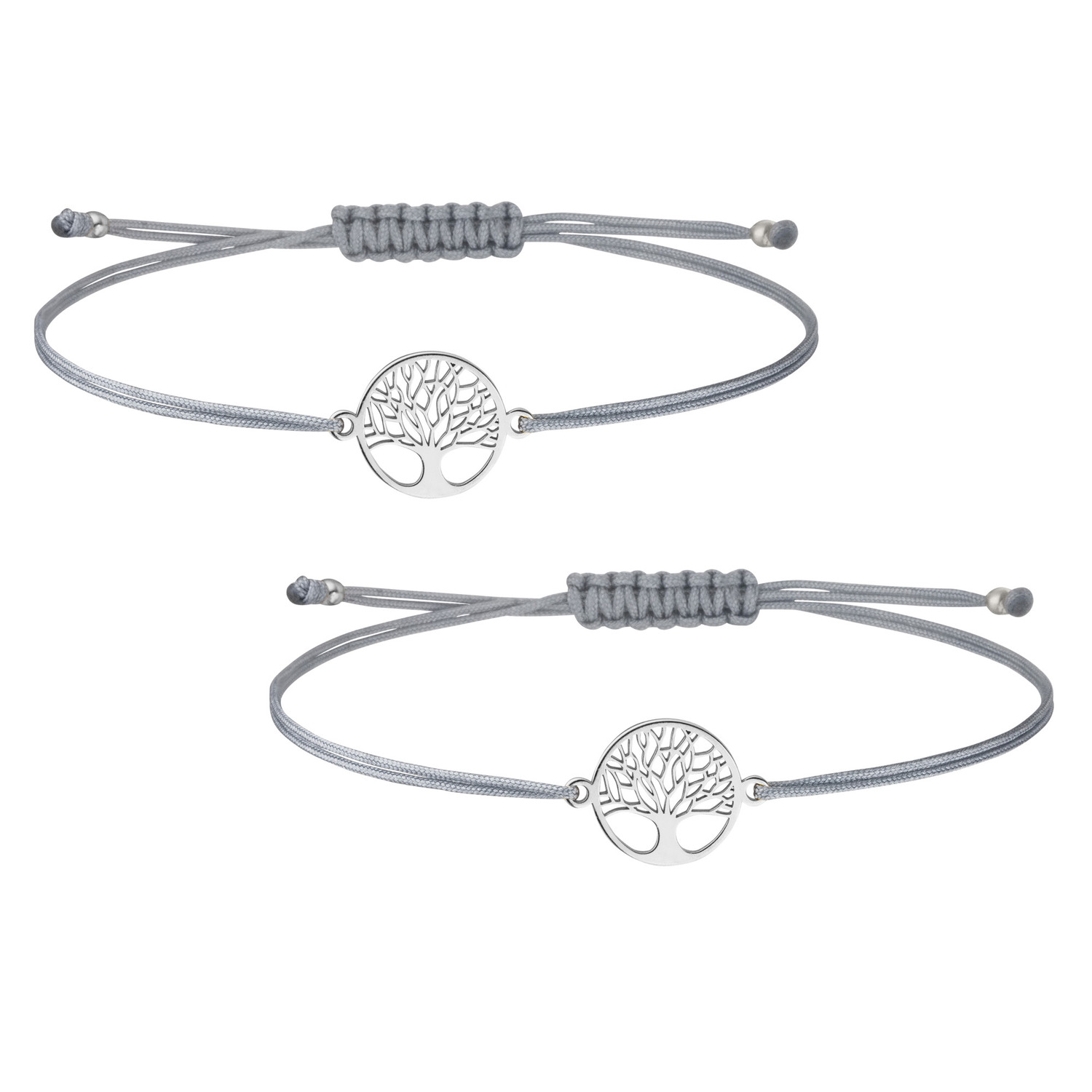 Zwei zierliche Textilarmbänder in Grau mit zwei kleine Lebensbäume aus vergoldetem 925 Silber.