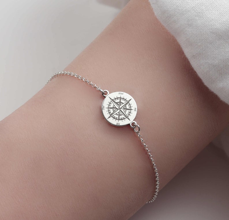 Eine zierliche Armkette mit einem Kompass-Anhänger aus 925 Silber. Die bedeutungsvolle Windrose ist graviert und kommt sehr schön im Kontrast mit dem Silber-Plättchen heraus.