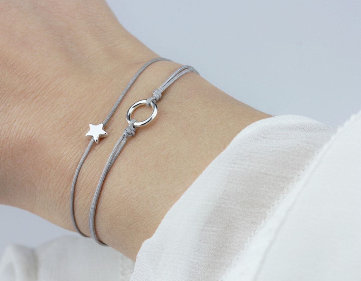 Zwei zierliche Textilarmbänder in Grau mit einem Stern und Kreis Symbol aus 925 Silber.