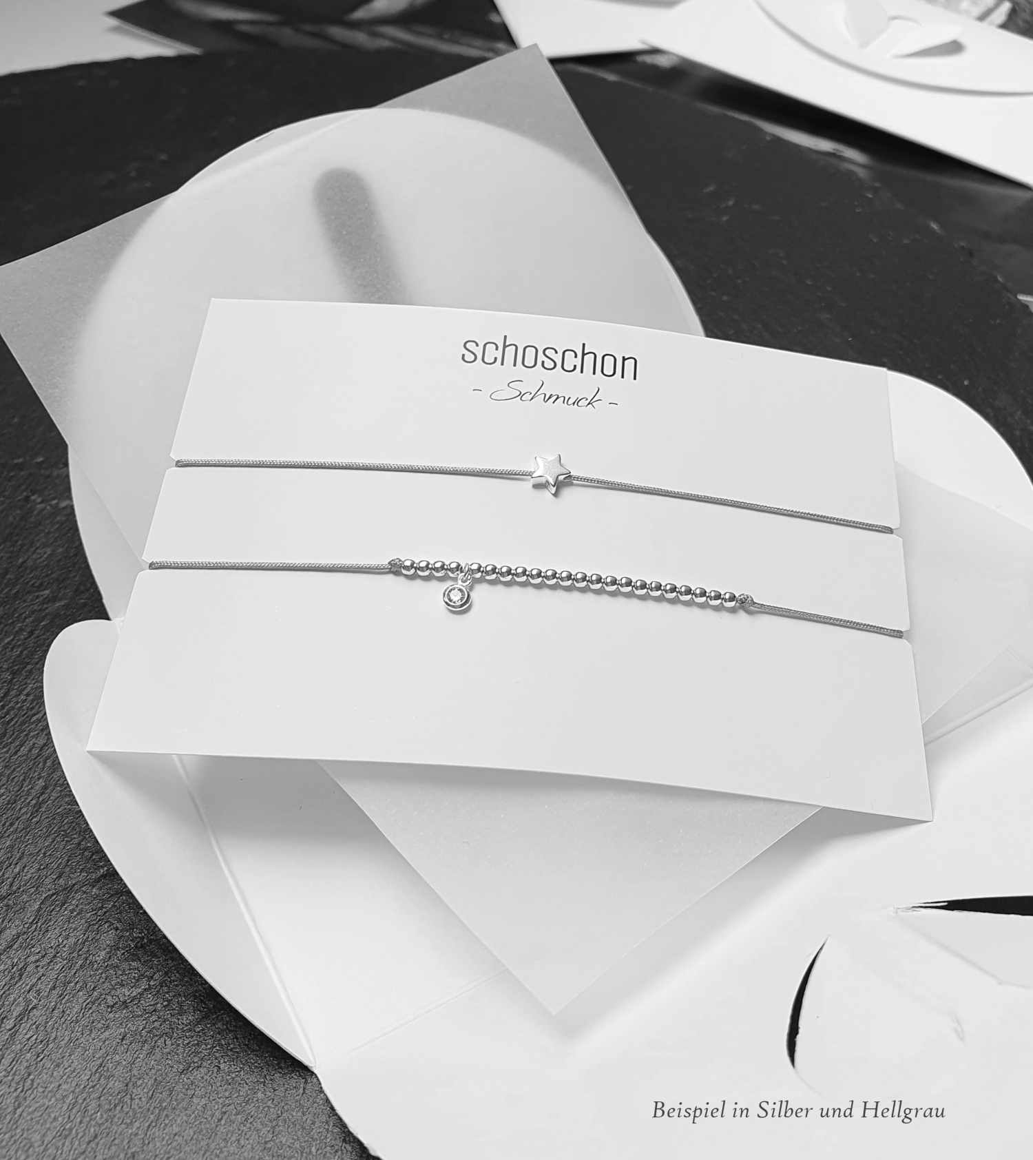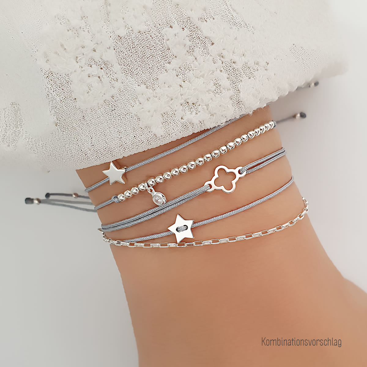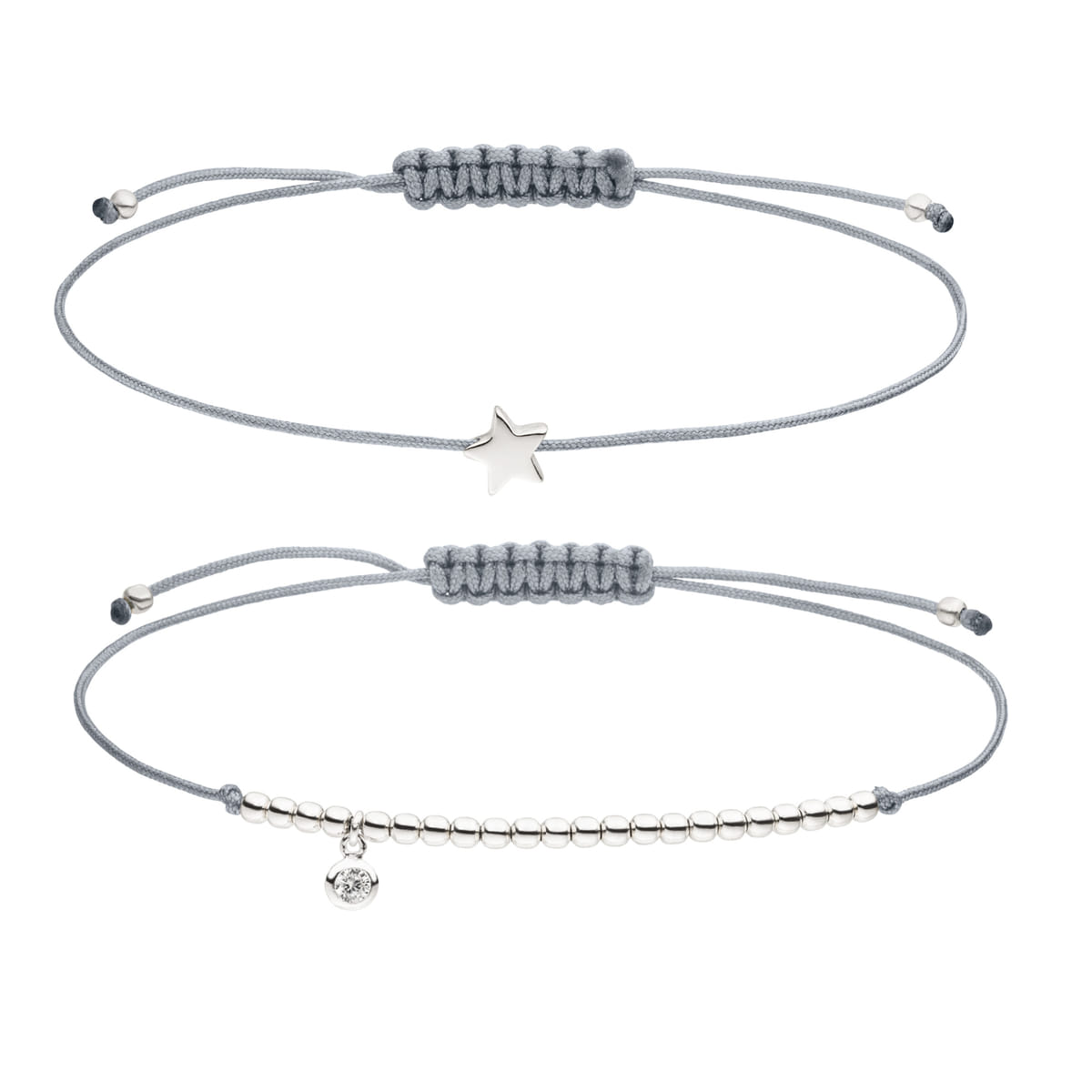 Zwei zierliche Textilarmbänder in Grau mit feinen 925 Silberperlen und einem Sternsymbol.