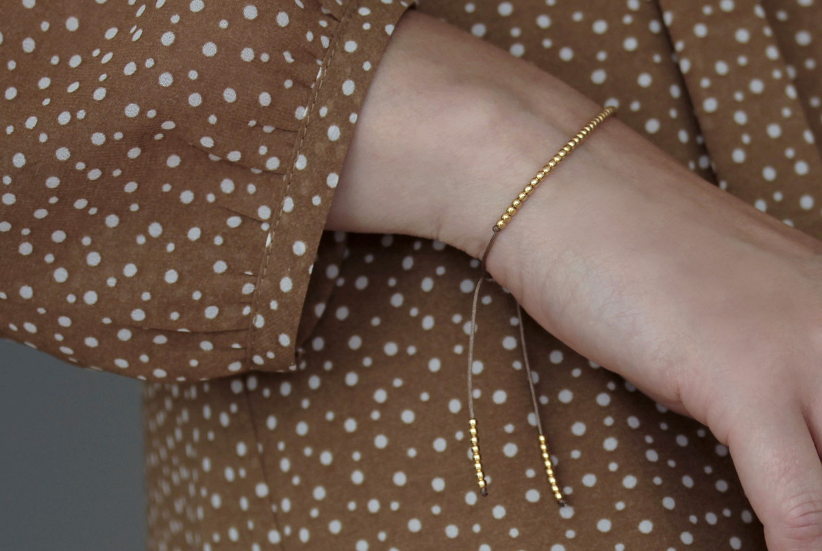 Zierliches Textilarmband in Taupe Farbe mit kleinen 2,2 mm vergoldeten Kügelchen aus 925 Silber.