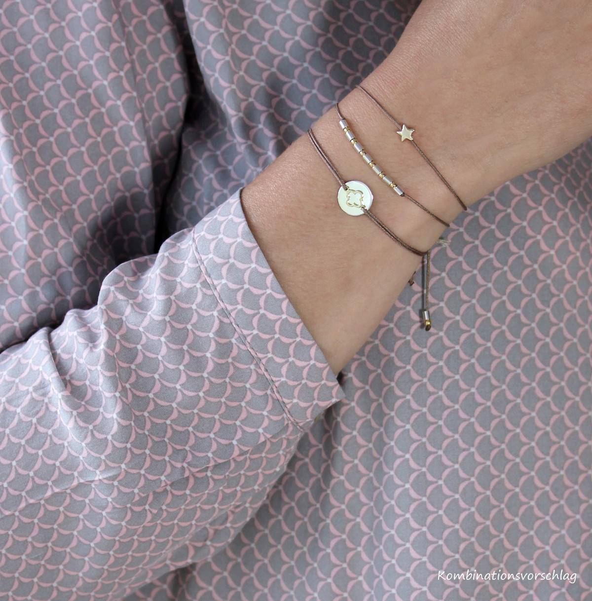 Textilarmband in Nude Farbe mit 925 Silber teils rosevergoldeten Elementen.