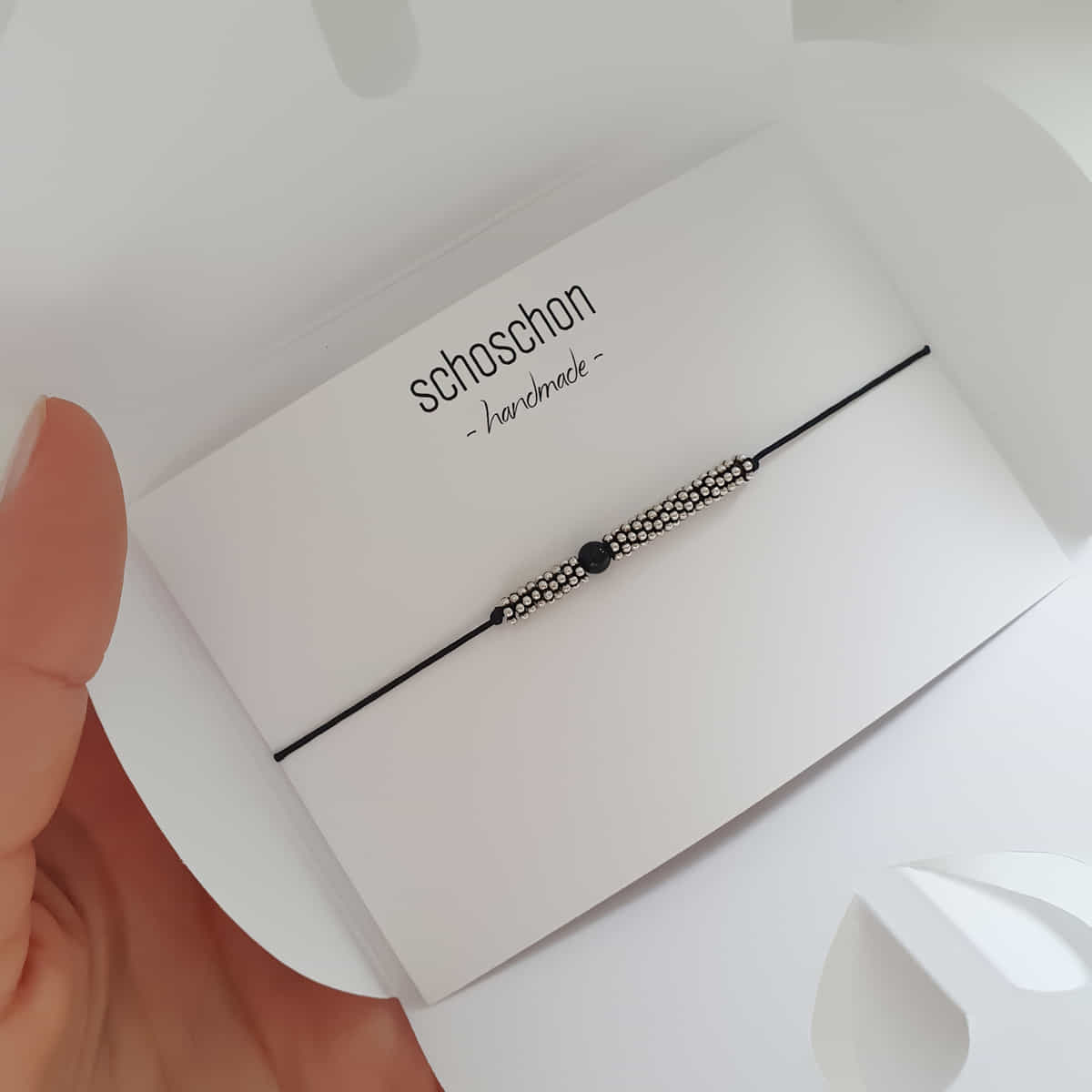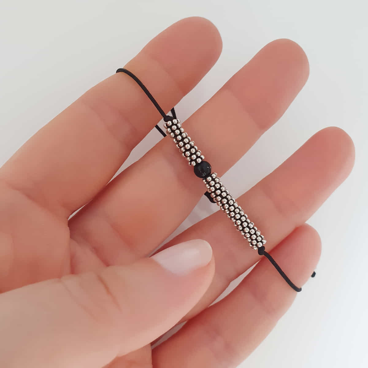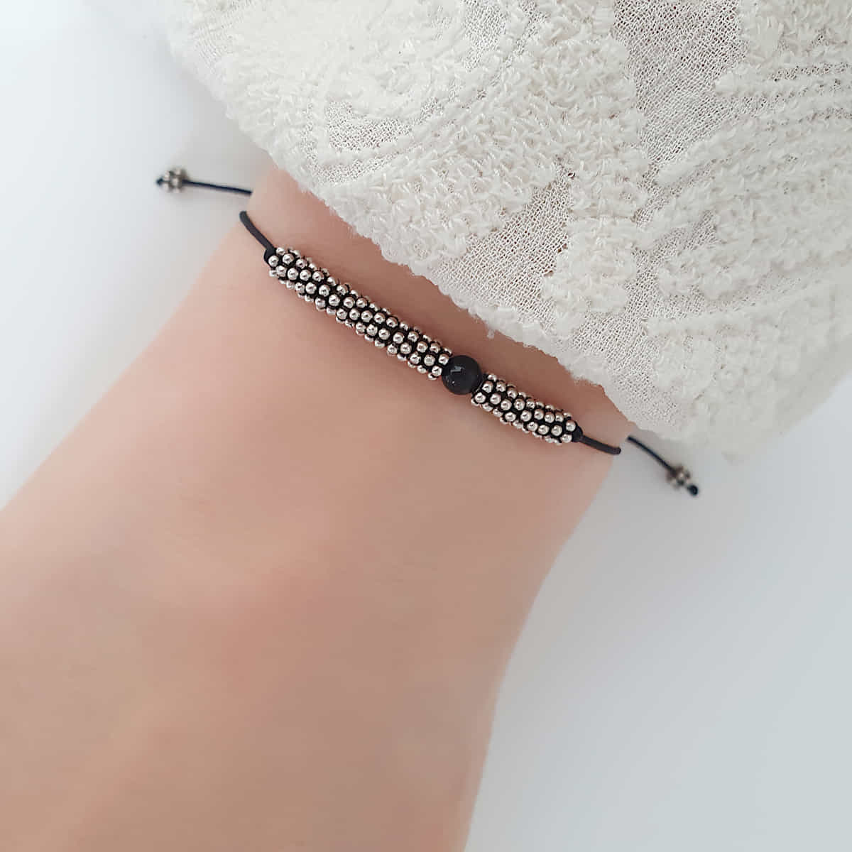 Ein stilvolles Textilarmband in tiefem Schwarz (Onyx Perle), veredelt mit glänzenden Silberelementen (925 Silber) – ein besonderes Highlight für dein Sommer-Outfit!