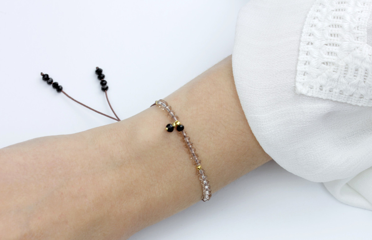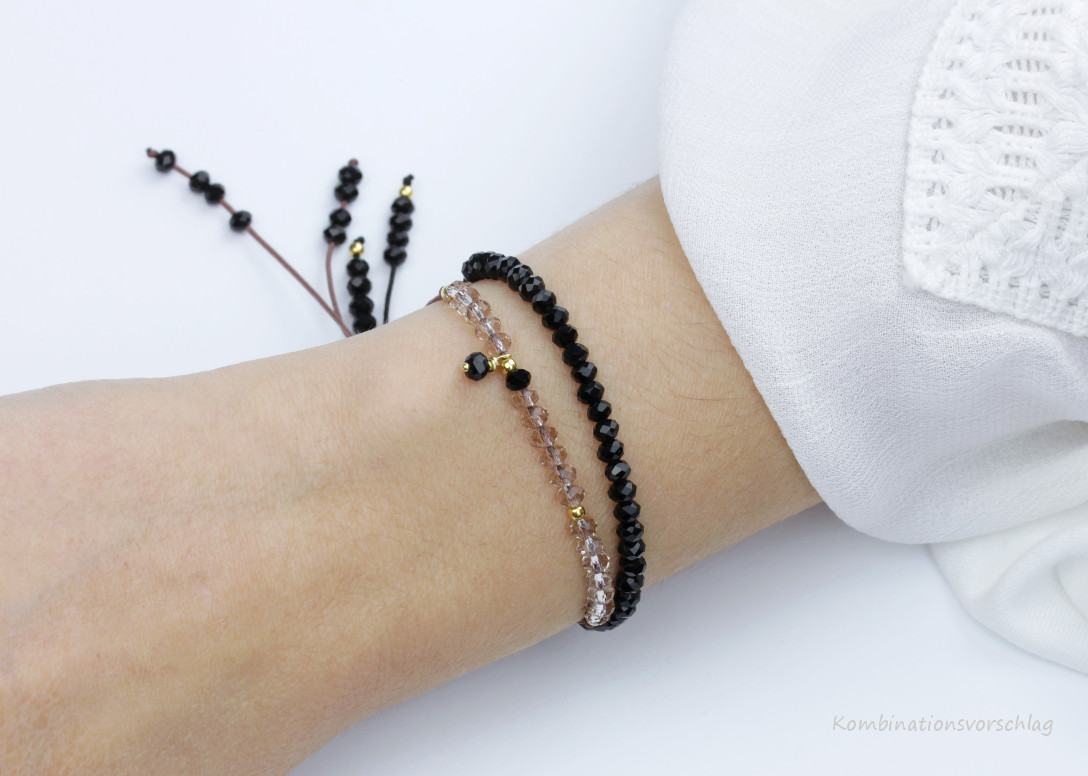 Armband aus Glasschliffperlen und Textil Schnur in Beige,Braun,Gold und Schwarz.
