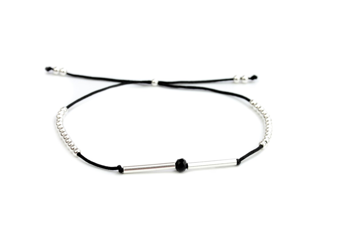 Textilarmband in Silber und Schwarz. 925 Silber Elementen und ein schwarze Glasperle vereinen sich zu einem trendigen Schmuckstück für Ihren lässigen Outfit.