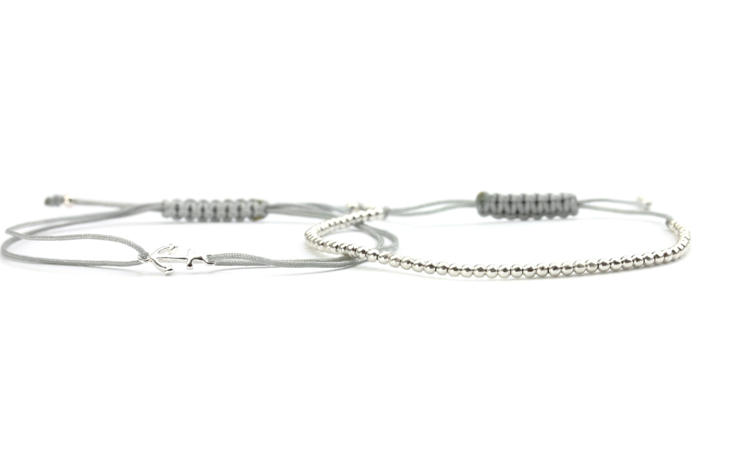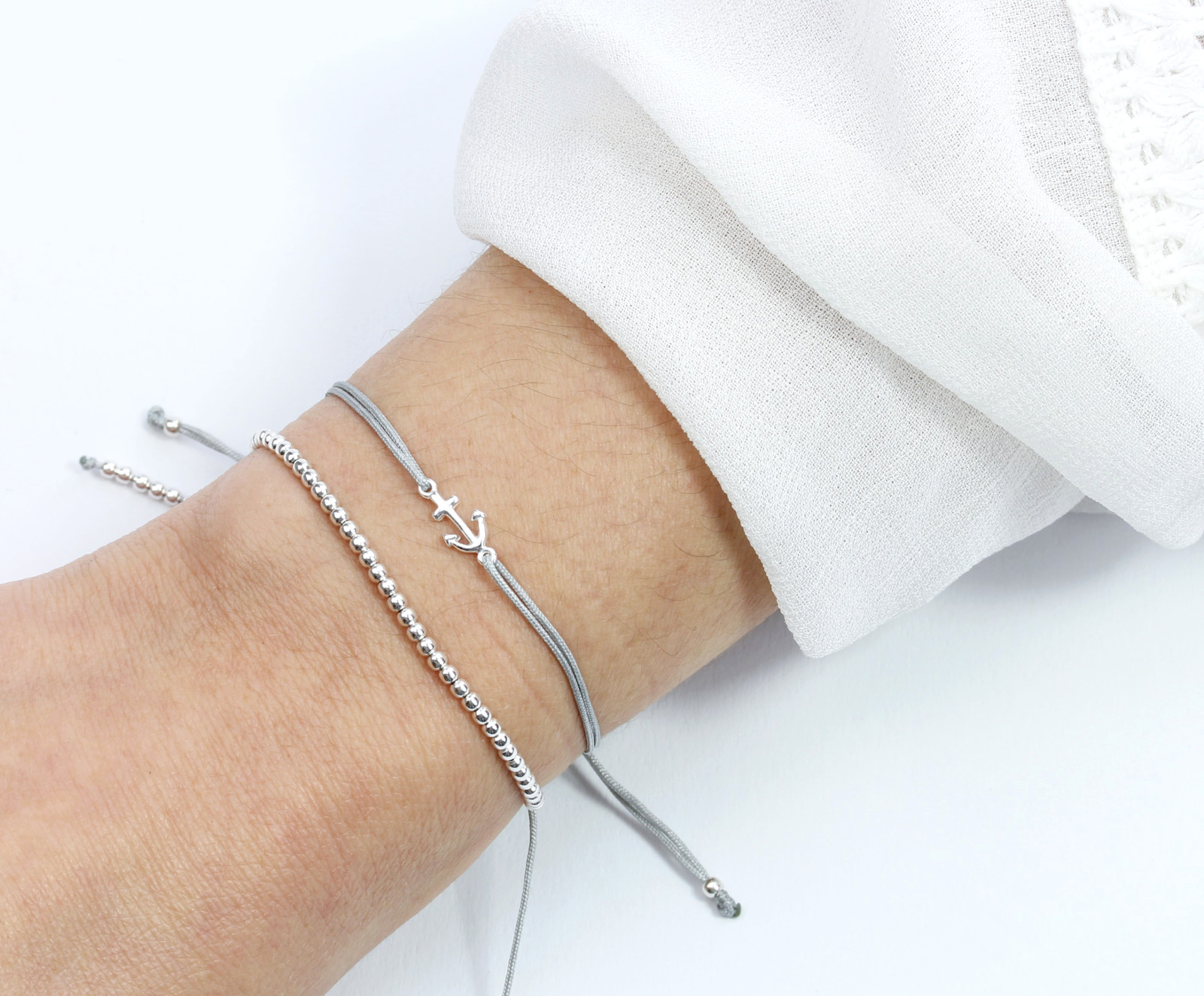 Zwei zierliche Textilarmbänder in Grau mit feinen 925 Silberperlen und einem Ankersymbol.