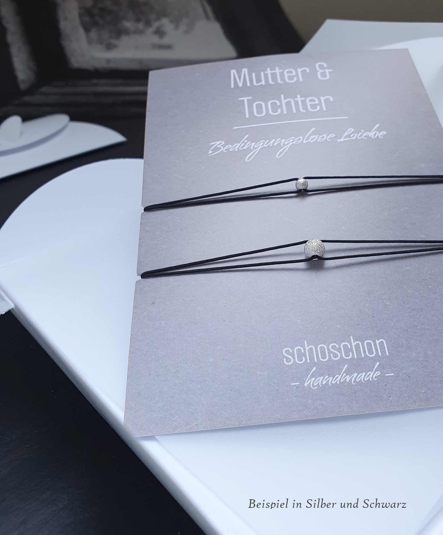 Zwei zierliche Textilarmbänder in Braun mit zwei Kugeln aus 925 Silber rosevergoldet. Unter „Optionen“ sind auch Varianten in Silber oder Silber vergoldet auswählbar. Die Kugeln haben zwei unterschiedliche Größen, für die Mutter 6 mm und für die Tochter 4 mm. Die Oberfläche der Kugeln ist diamantiert. Das ist eine Schliffart, die die Kugeln glänzen/funkeln lässt.