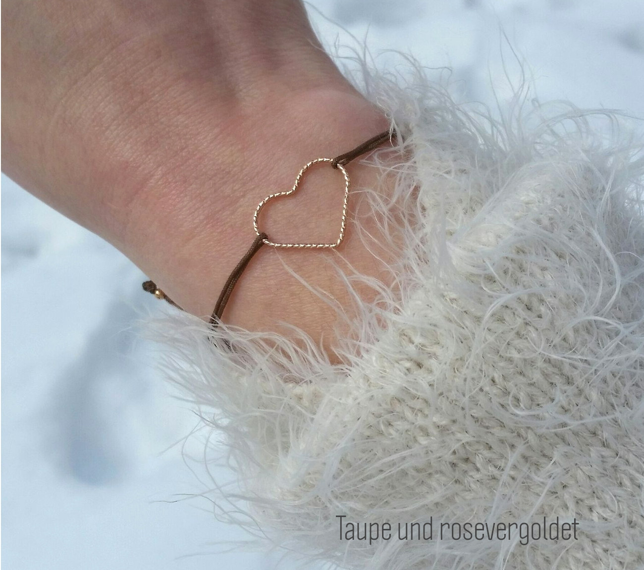 Feines und Zierliches Textilarmband in Nude mit einem großen Herzen aus 925 Silber rosevergoldet.
