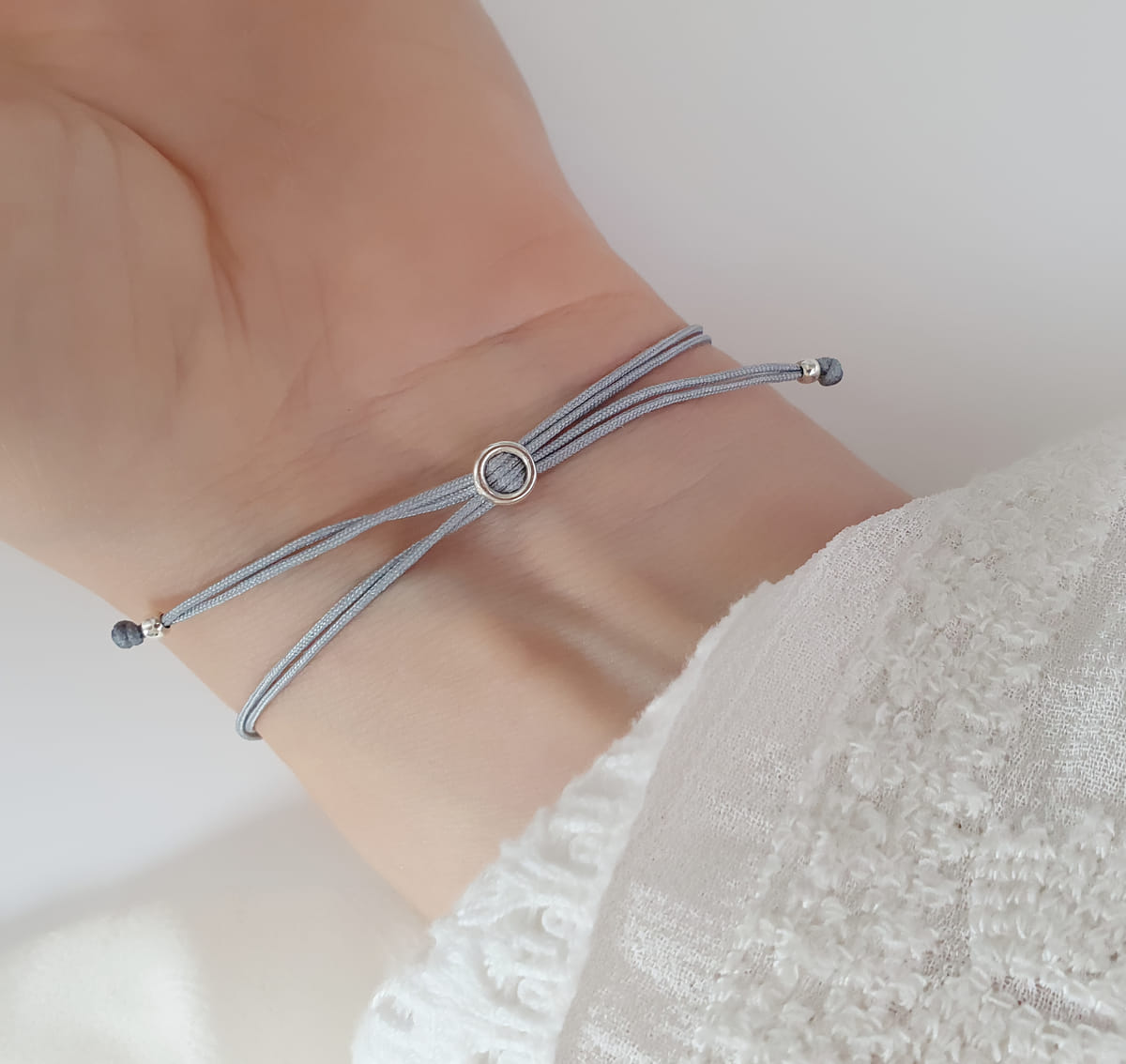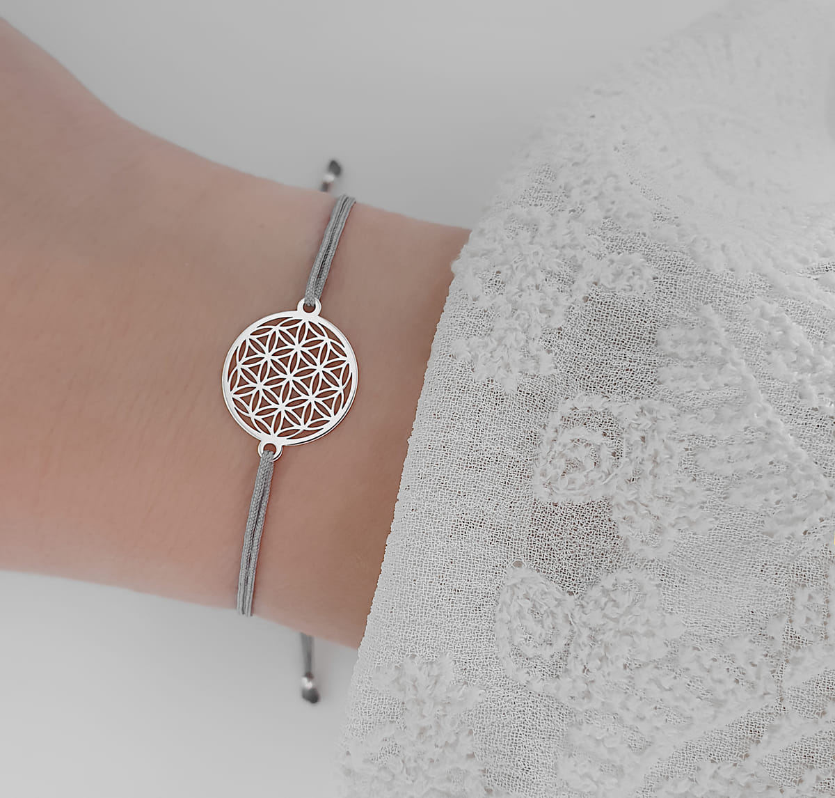 Zierliches Textilarmband in Grau ( wie abgebildet ) mit dem beliebten Symbol der Blume des Lebens aus 925 Silber.