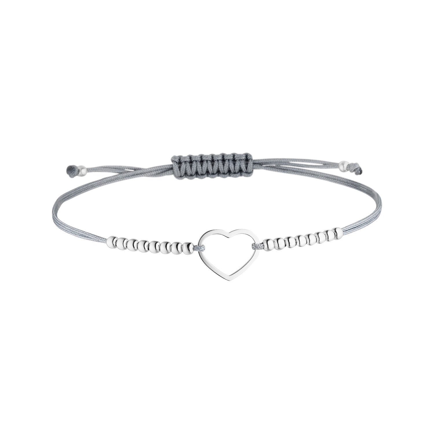Feines Textilarmband in Grau mit einem Herz-Symbol und Silberperlen aus 925 Silber.