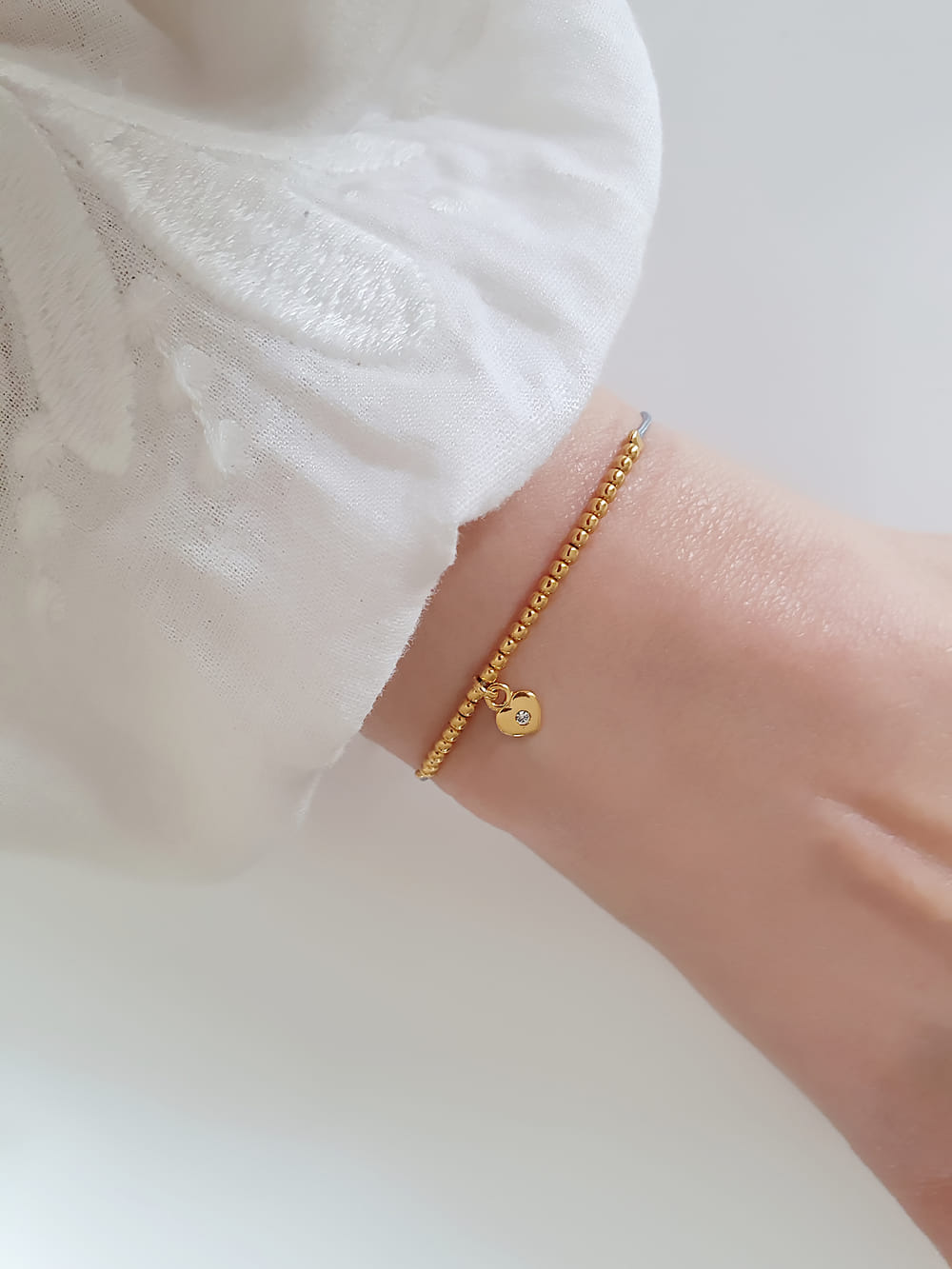Ein filigranes graues Armband, dessen Mitte von einigen Kügelchen aus 925 Silber vergoldet und einem kleinen Herzanhänger mit Zirkonia Stein geziert wird.