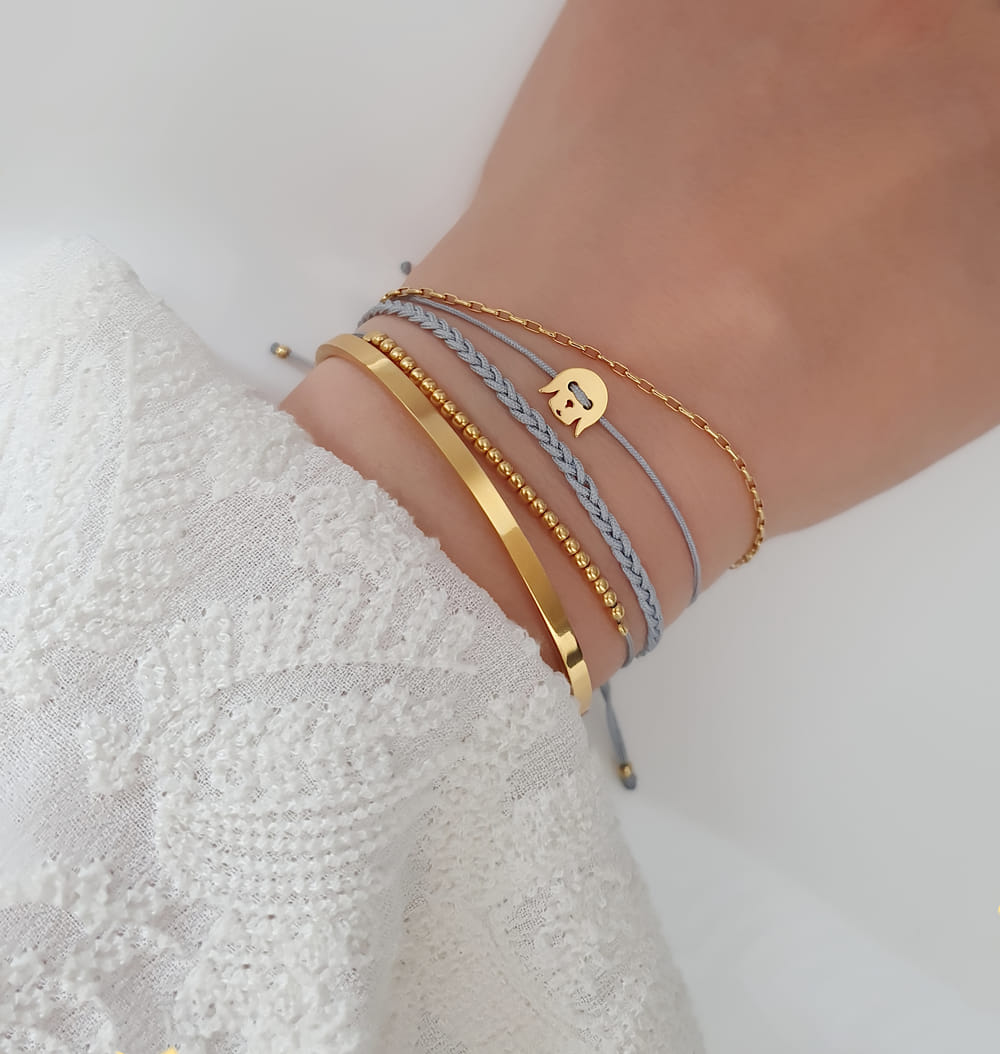 Ein zartes Textilarmband in Grau mit einem Hund Symbol aus 925 Silber vergoldet.
