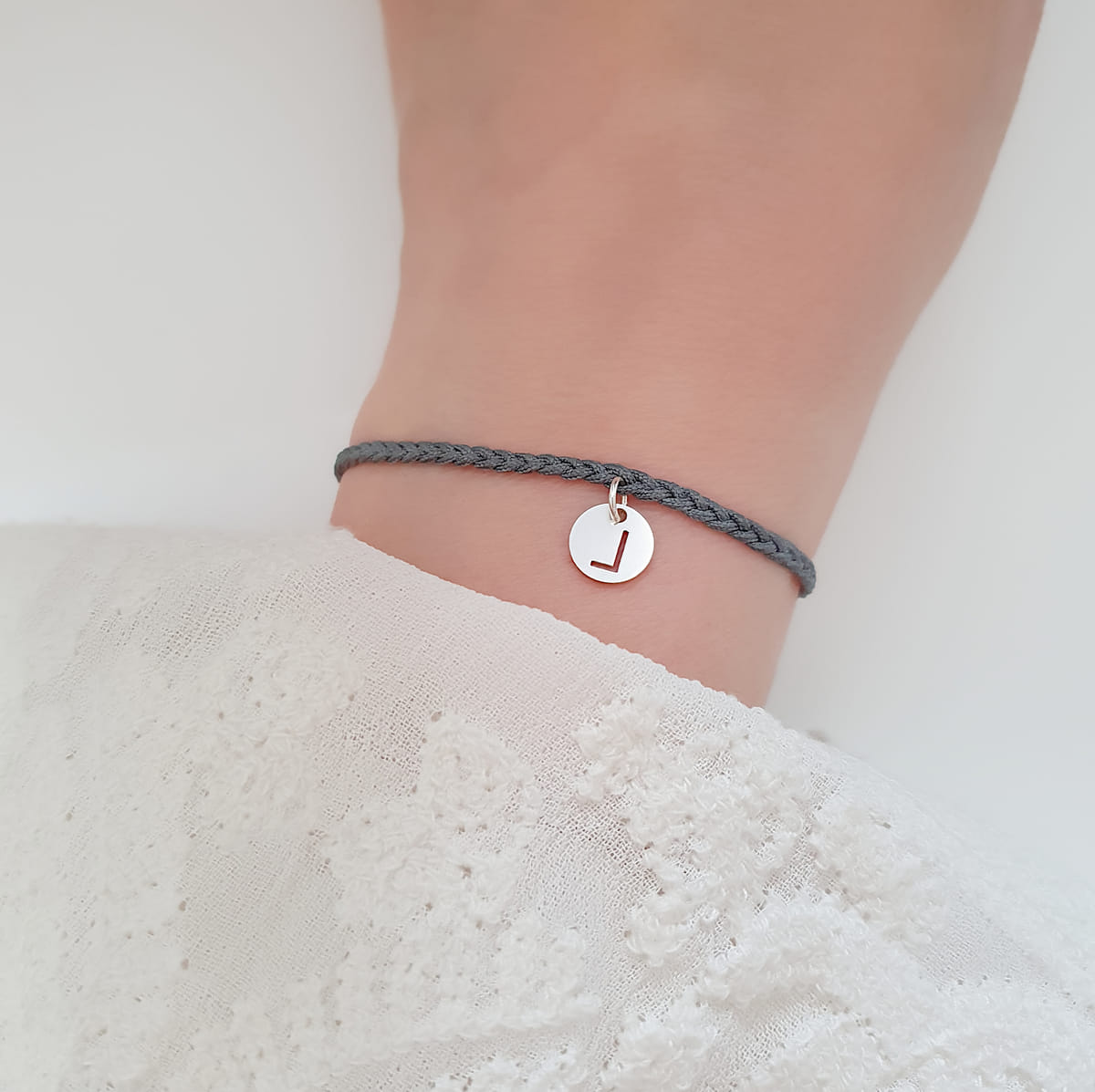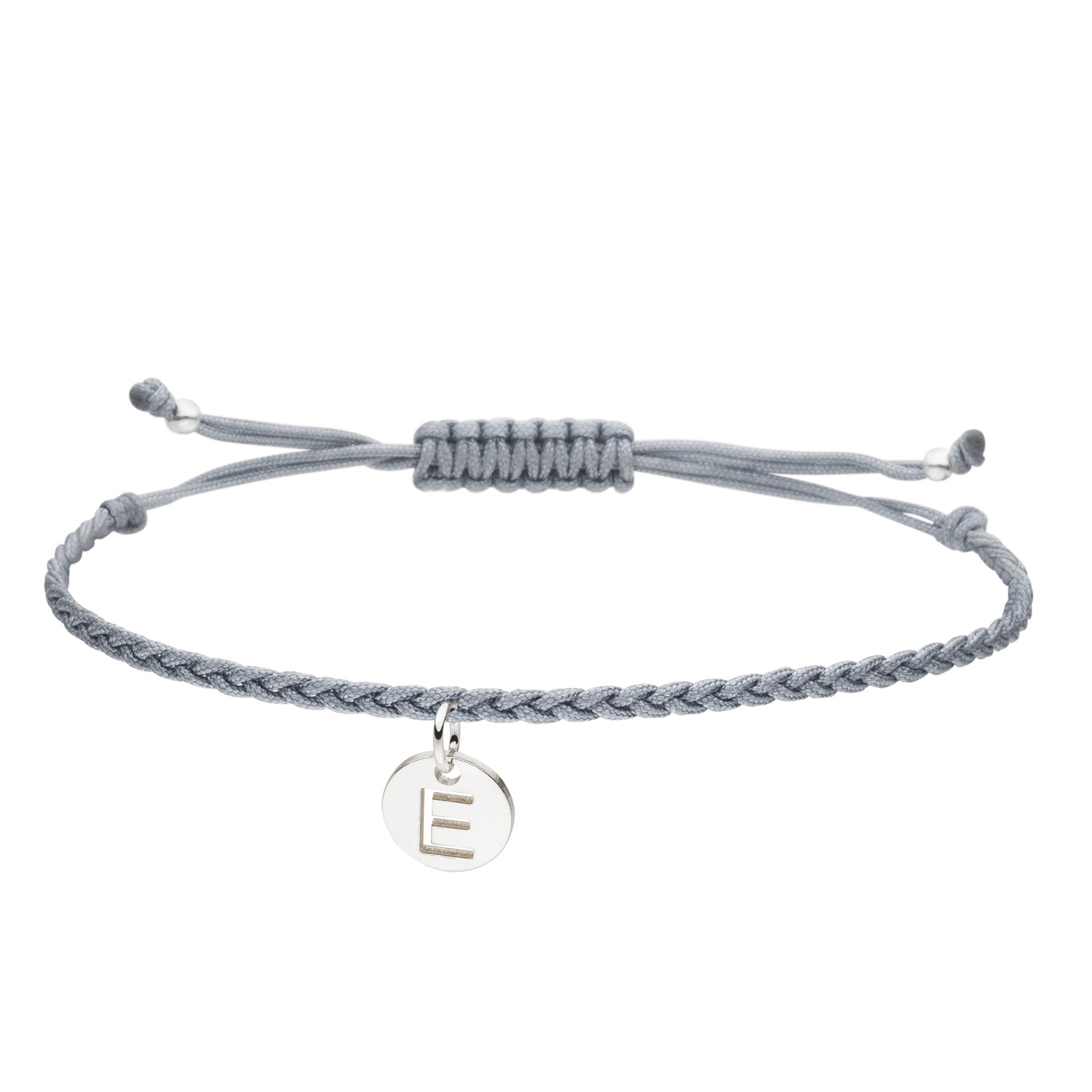 Geflochtenes Textilarmband in Dunkelgrau mit einem eleganten und schlichten L-Anhänger aus 925er Silber.