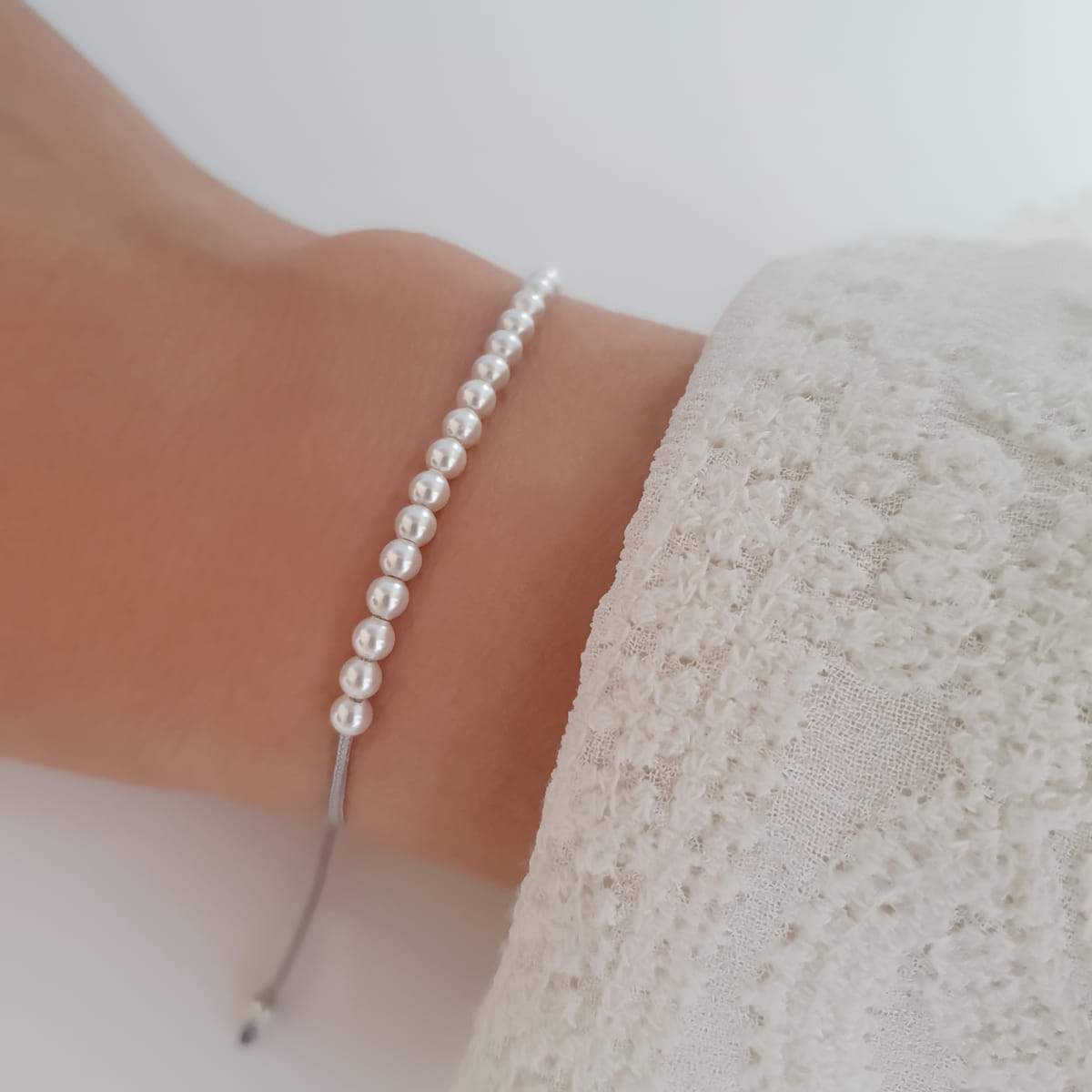 Ein filigranes Armband mit zarten weißen Perlen, das einen Hauch von zeitloser Schönheit ausstrahlt