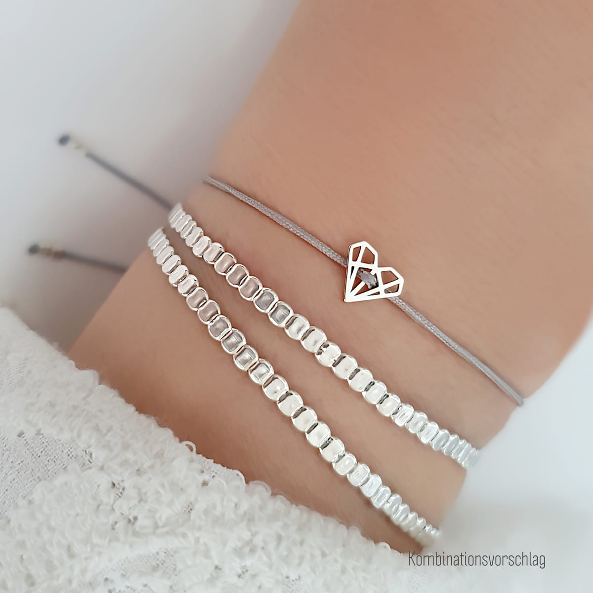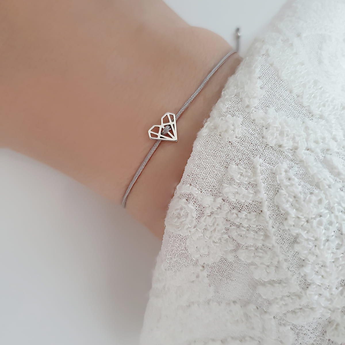 Ein hellgraues Textilarmband, verziert mit einem charmanten minimalistischen Charm in Form eines Origami-Herzens. Das Papierherzsymbol aus 925er Silber, verleiht deinem Stil einen Hauch von romantischer Eleganz.