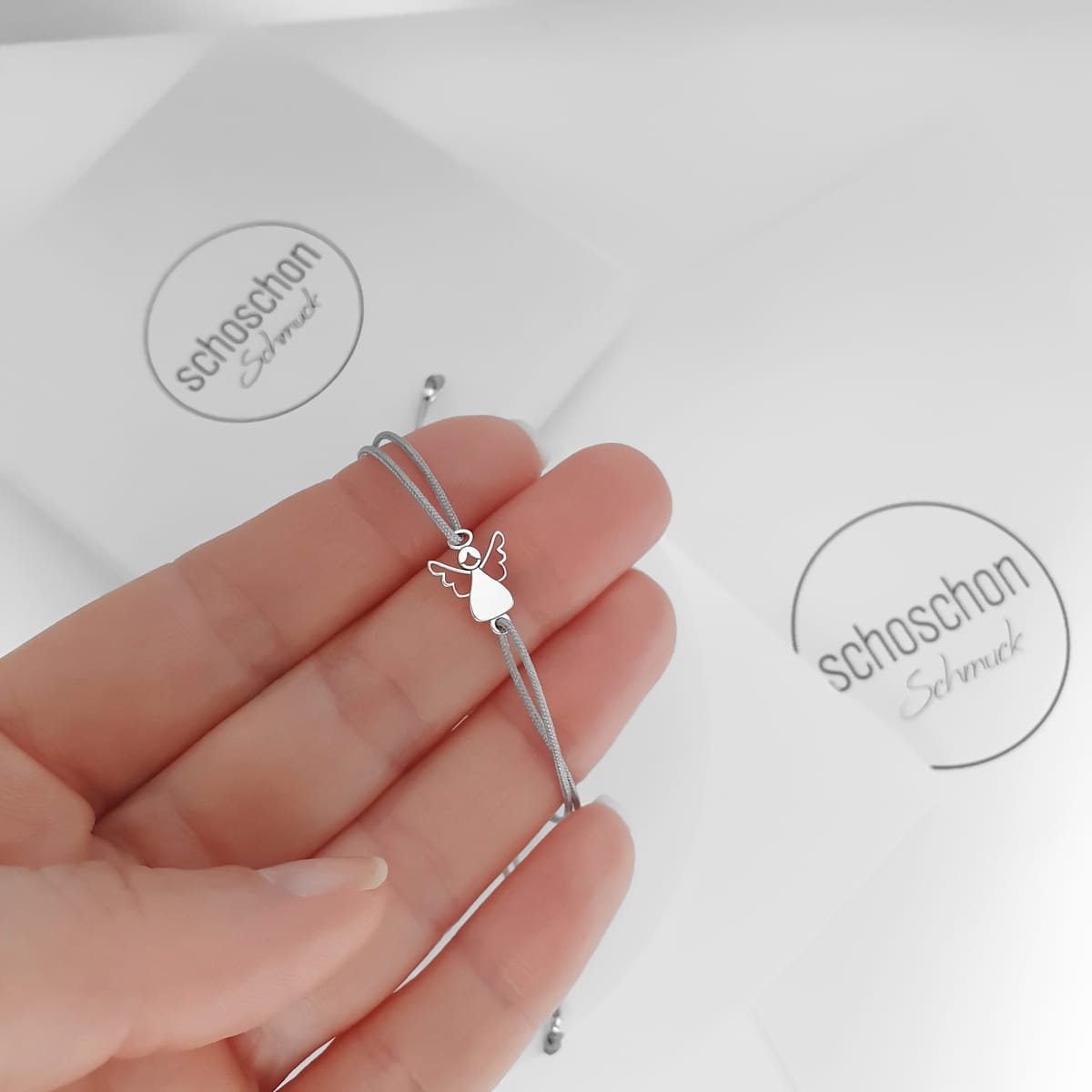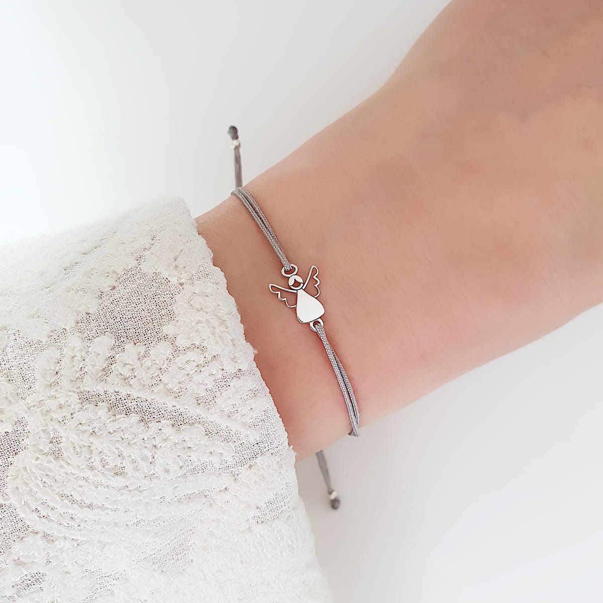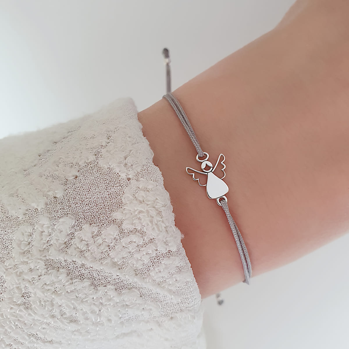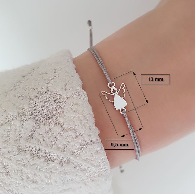 Ein feines handgemachtes Armband aus einem zarten Nylonband, das von einem bezaubernden Engel-Anhänger geschmückt wird, der aus 925 Silber gefertigt ist.