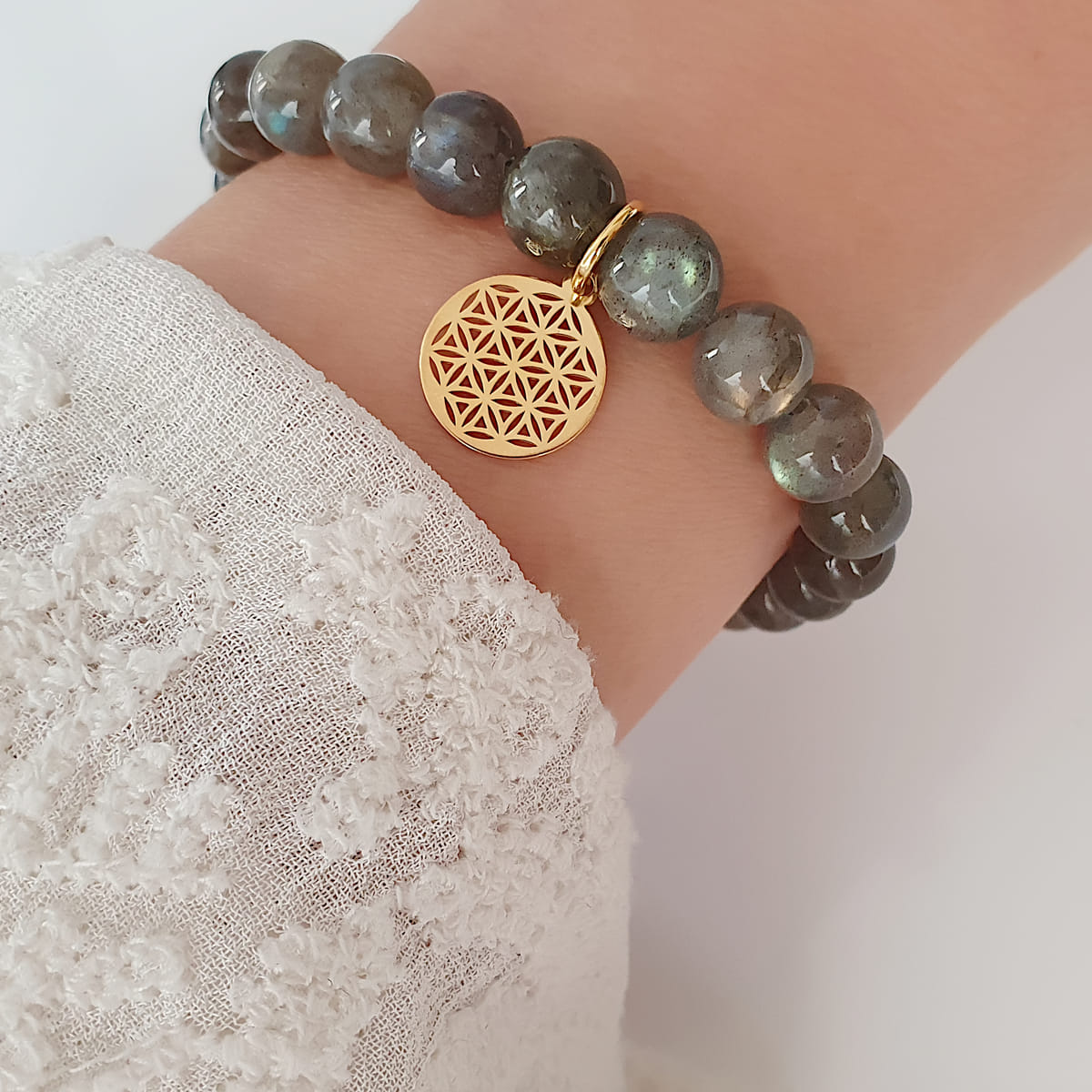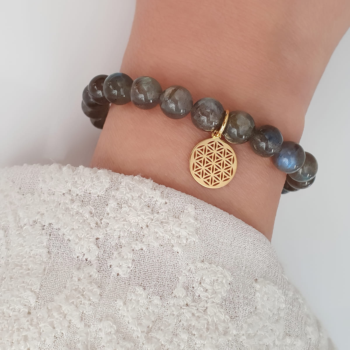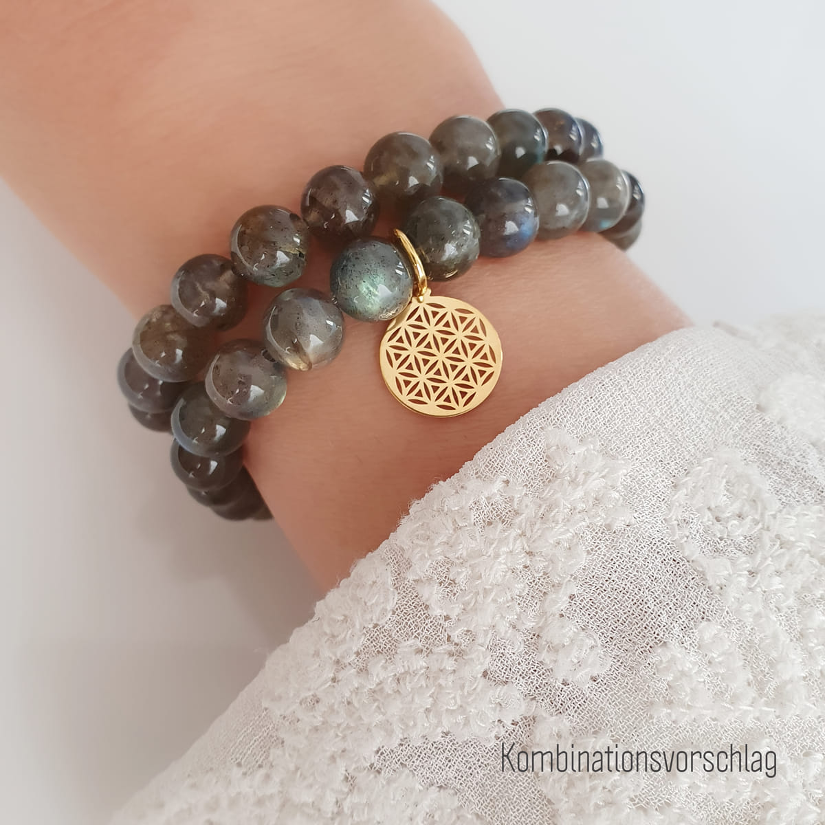 Blume des Lebens Armband Labradorit 925 Silber vergoldet- Naturstein Elastisch