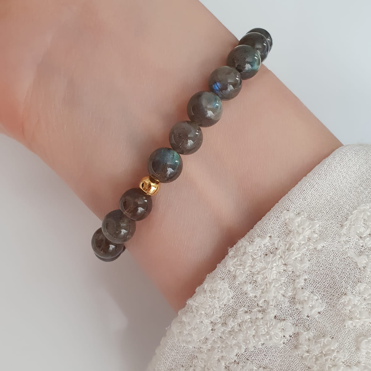 Dieses Stretch-Armband aus Labradorit-Perlen und 925 Silber vergoldet vereint sich zu diesem trendigen Schmuckstück.