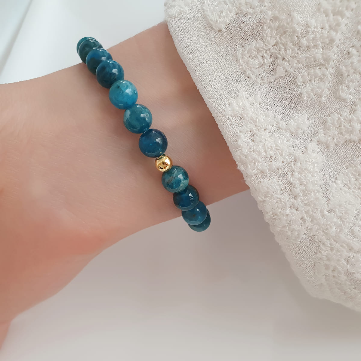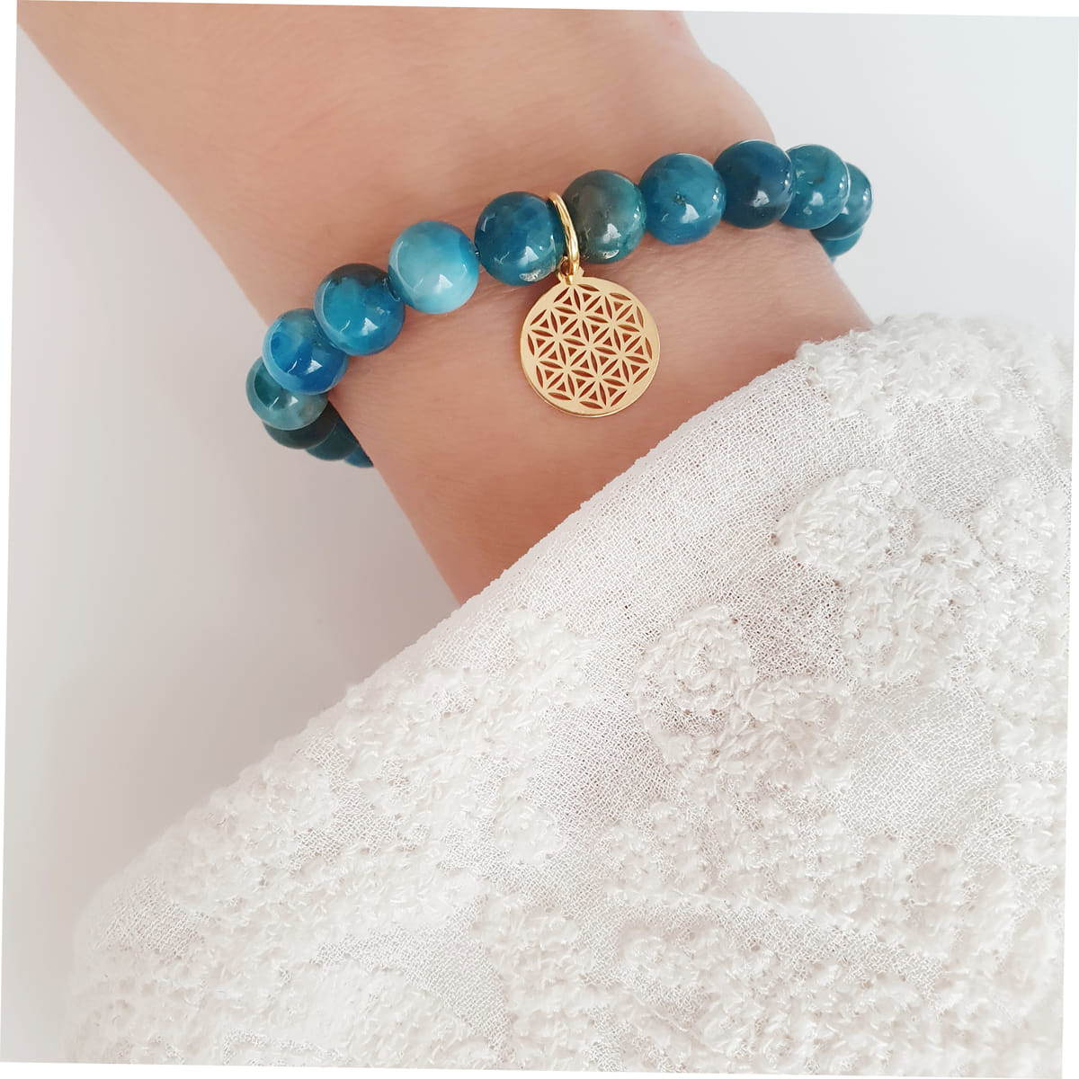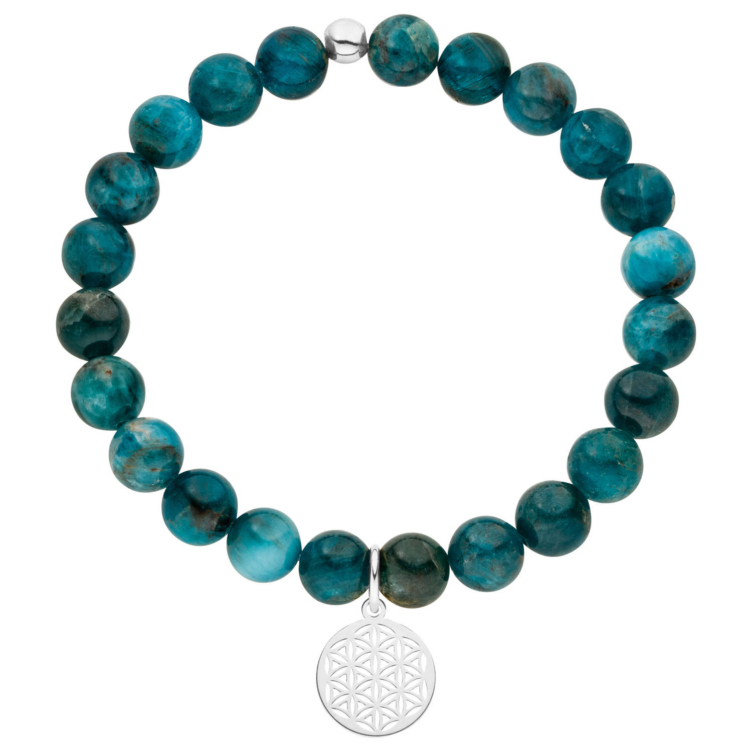 Dieses trendige Schmuckstück ist ein Stretch-Armband, gefertigt aus Apatit-Perlen und 925er Silber, das vergoldet wurde. Es verfügt über einen zarten Anhänger in Form einer Lebensblume, ebenfalls aus vergoldetem 925er Silber.