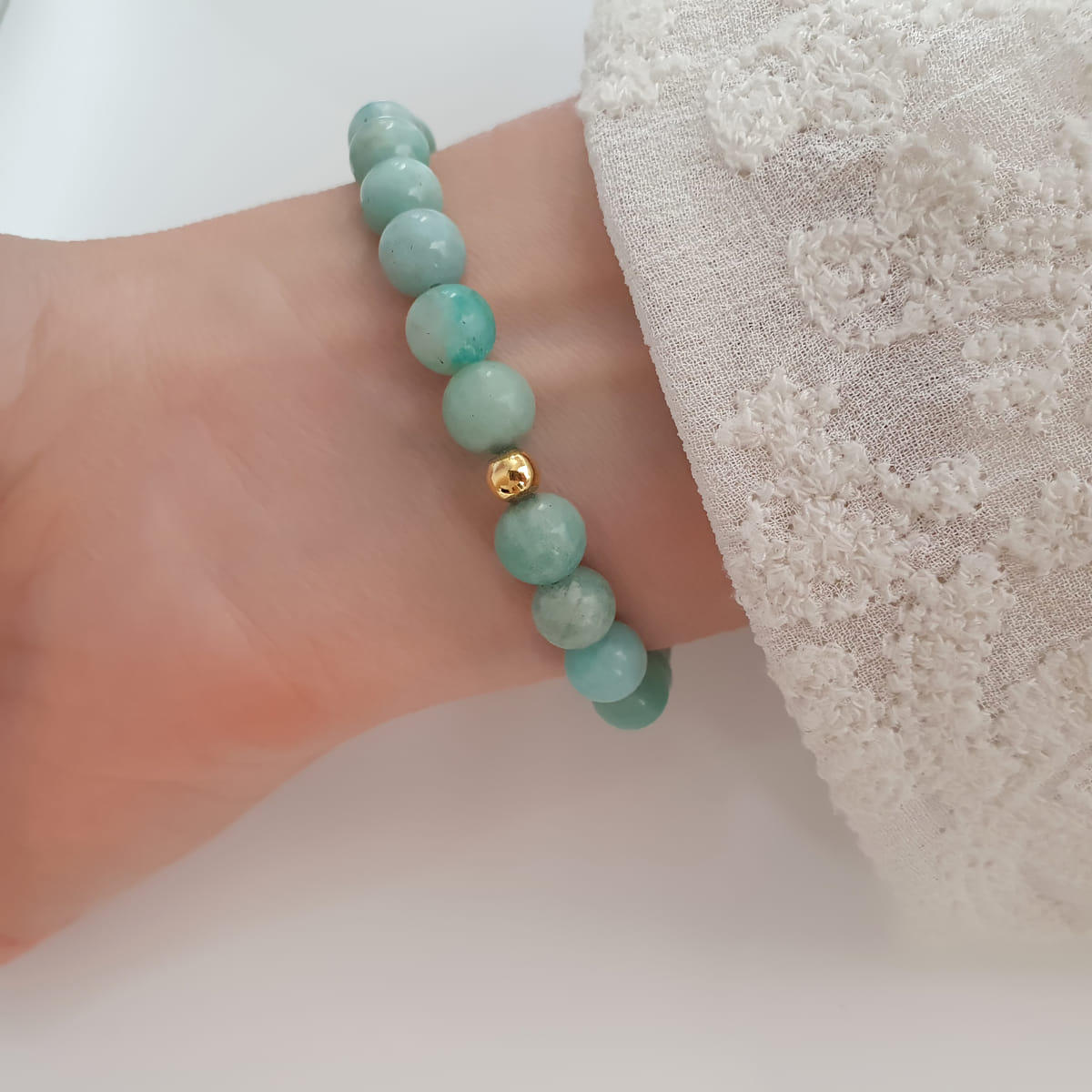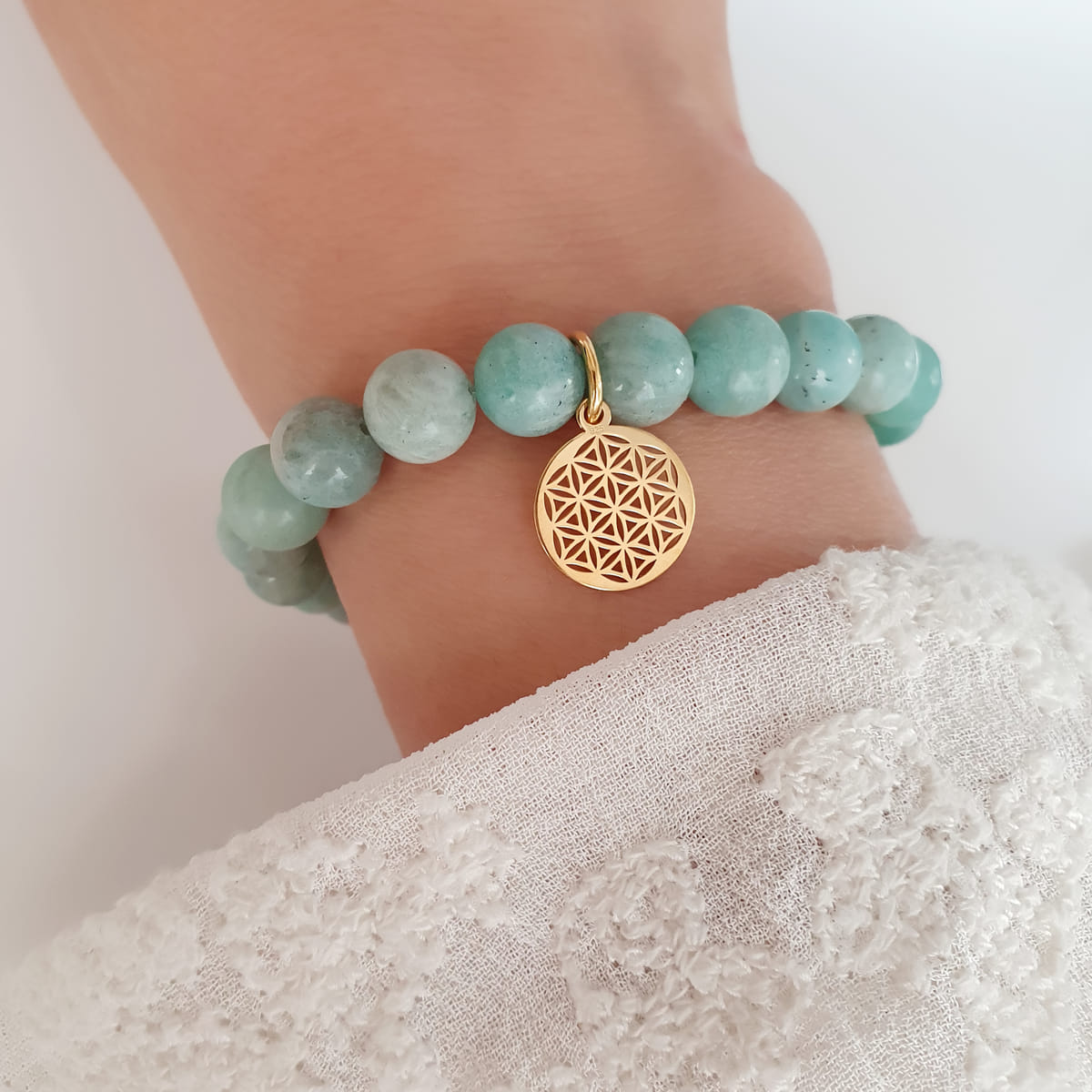 Dieses trendige Schmuckstück ist ein Stretch-Armband, gefertigt aus Amazonit-Perlen und 925er Silber, das vergoldet wurde. Es verfügt über einen zarten Anhänger in Form einer Lebensblume, ebenfalls aus vergoldetem 925er Silber.