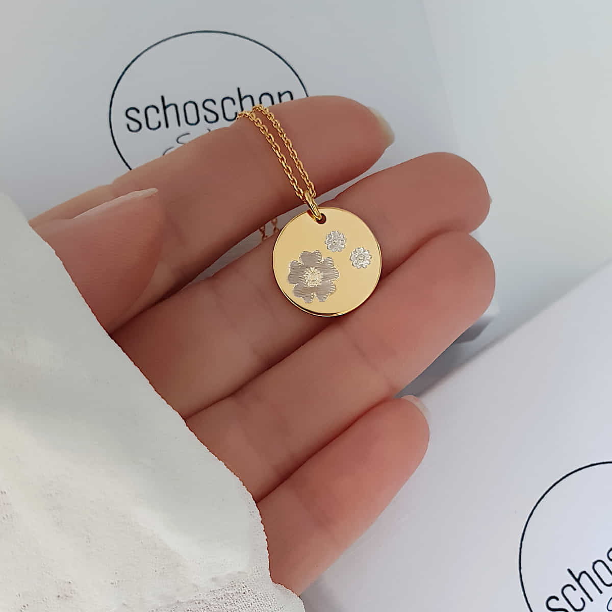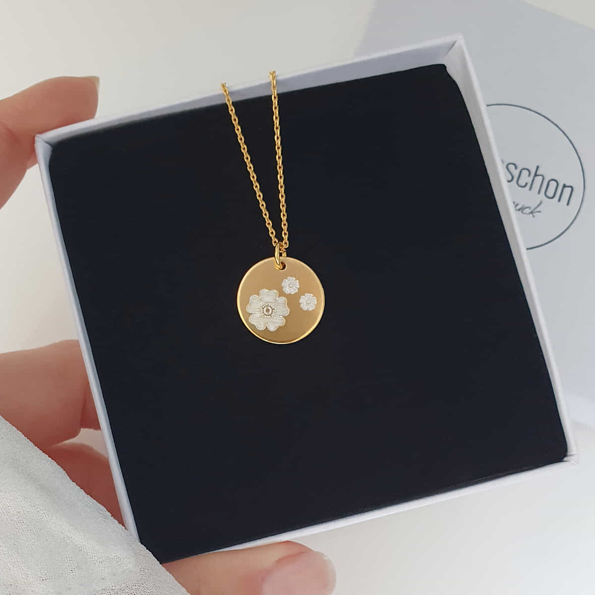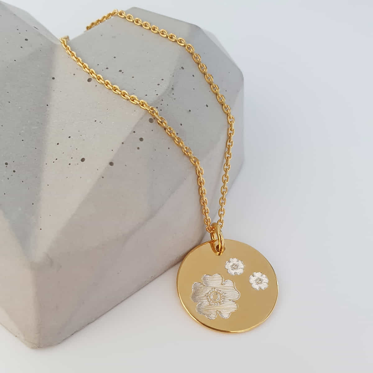 Gravur Blumen-Anhänger – vergoldete 925 Silber Kette, Geschenk für Sie