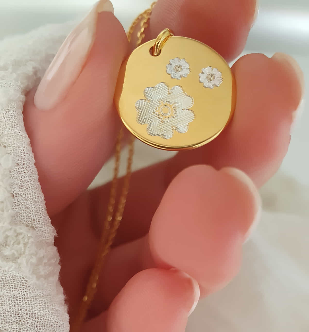 Zart und voller Poesie – die vergoldete Silberkette zeigt ein rundes Medaillon mit drei fein eingravierten Blüten. Das warme Gold und die filigrane Gravur verleihen ihr eine sanfte, elegante Ausstrahlung – ein stilvoller Begleiter für jeden Tag. Die drei Blüten erinnern an die Schönheit der Natur und machen die Kette zu einem besonderen Detail, das jedes Outfit harmonisch abrundet.