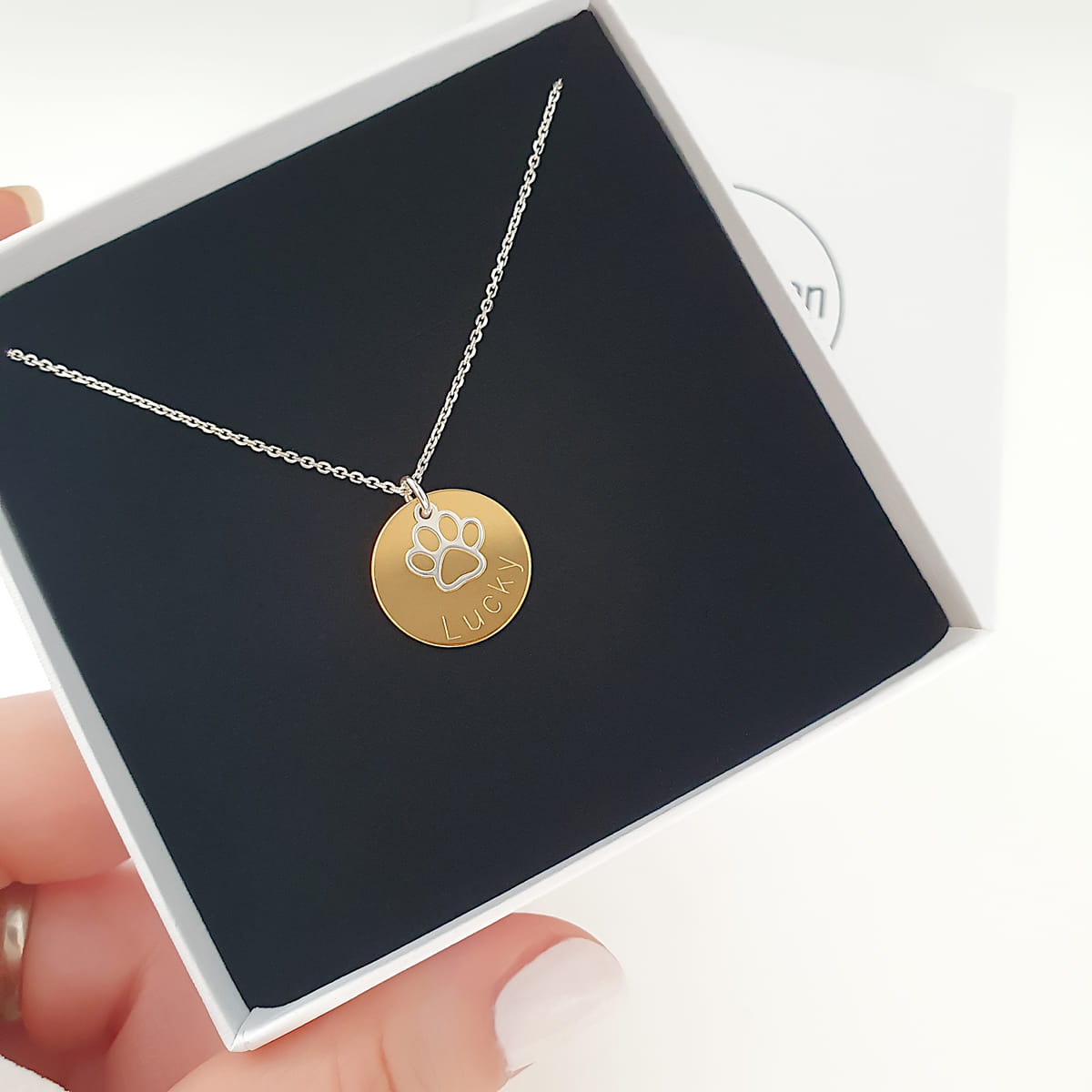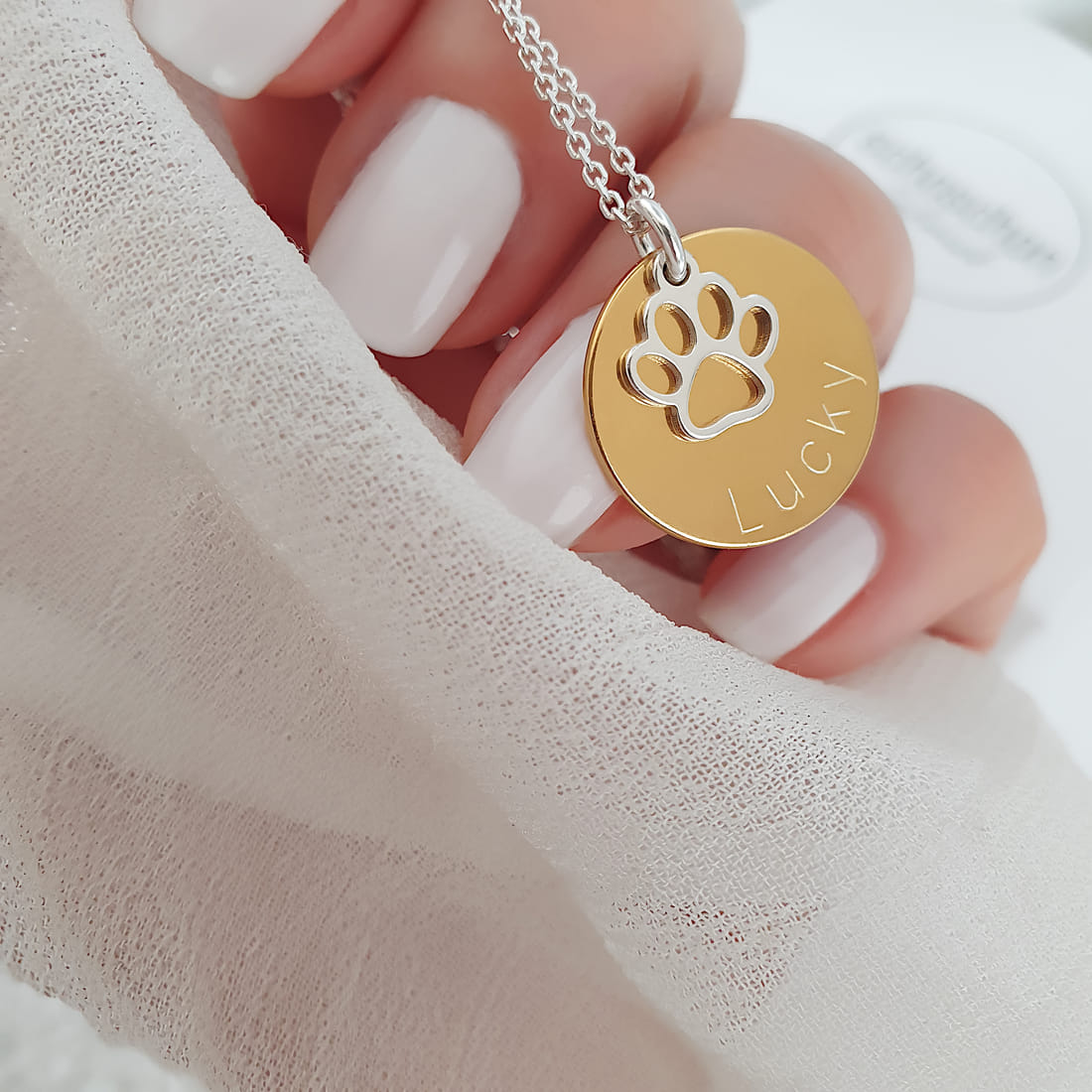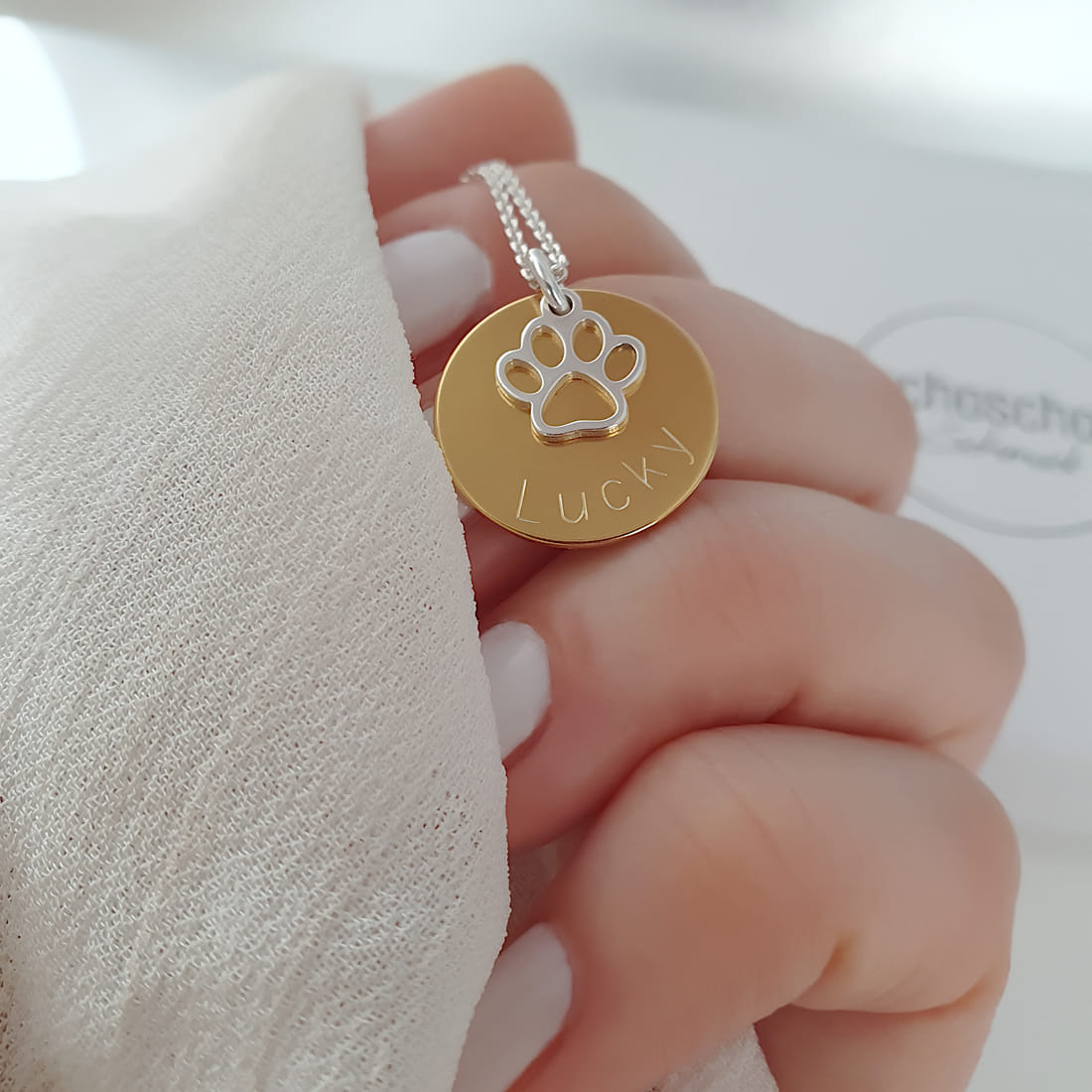 Pfote Halskette Plättchen 925 Silber teils vergoldet - Wunschgravur Haustier Charm