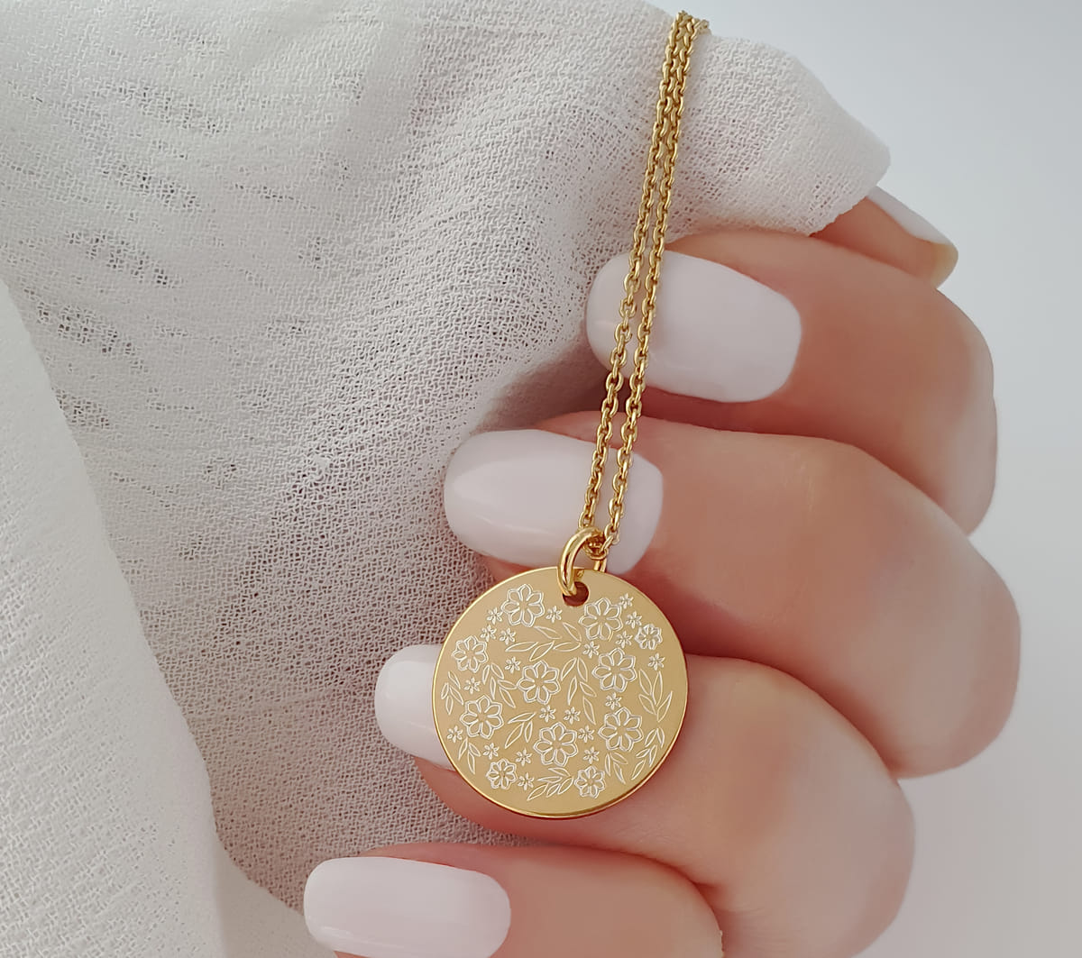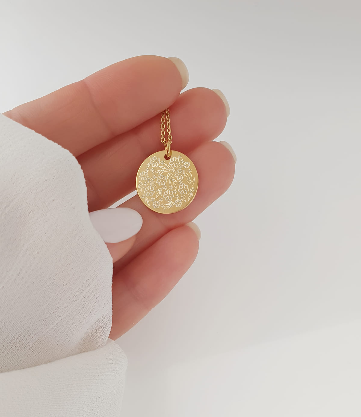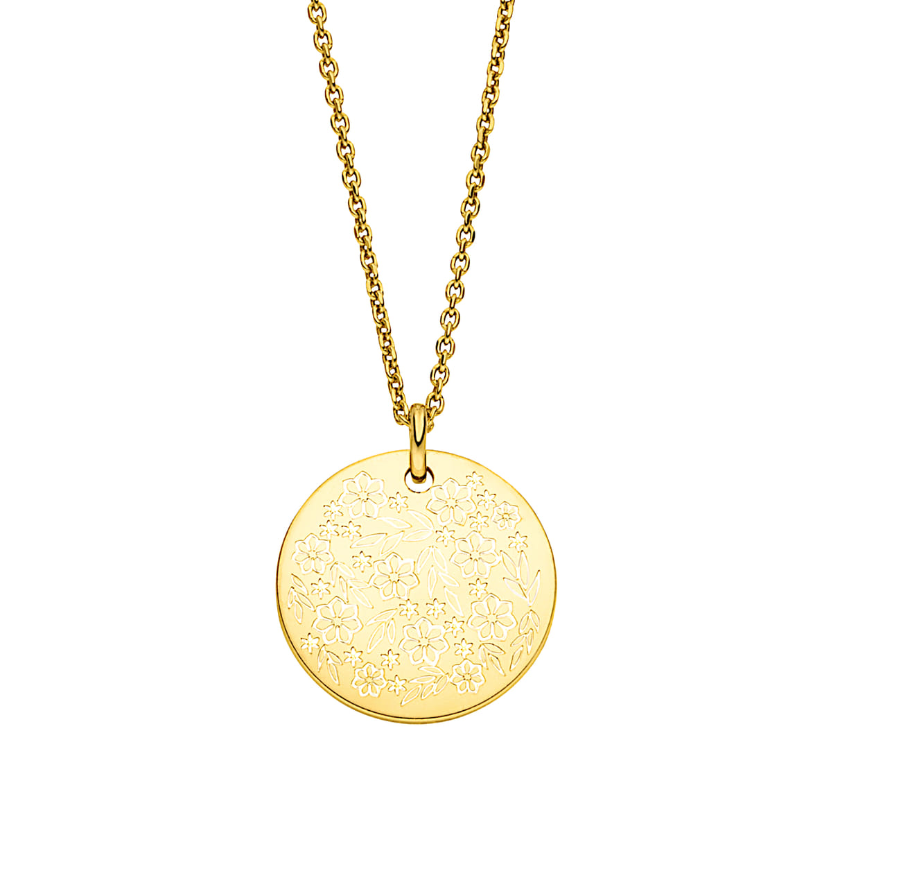 Eine Kette aus 925 Silber vergoldet mit einem runden Anhänger, dessen Oberfläche von einer zierlichen floralen Gravur geziert wird.