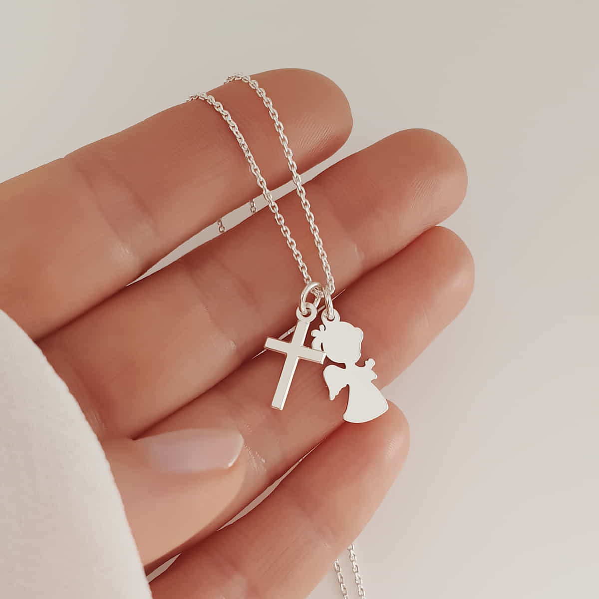 Der erste Anhänger zeigt einen filigran gearbeiteten betenden Engel aus 925er Silber, der durch seine detailreiche Gestaltung beeindruckt. Der zweite Anhänger, ein schlichtes Silberkreuz, besticht mit seiner klaren Form und zeitlosen Eleganz. Gemeinsam ergeben sie eine stilvolle Kombination, die sich harmonisch in jedes Outfit einfügt – ob im Alltag oder zu besonderen Anlässen. Ein Schmuckstück mit tiefgehender Bedeutung und zeitloser Schönheit.