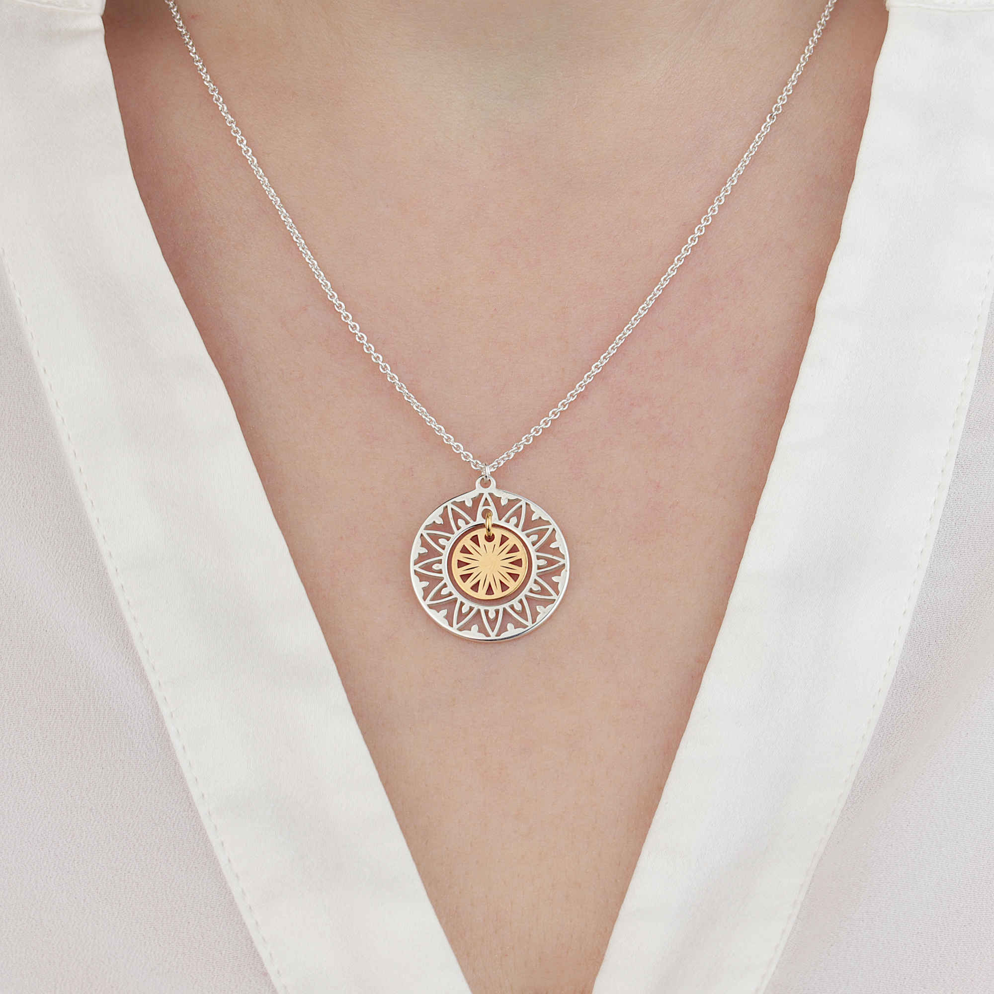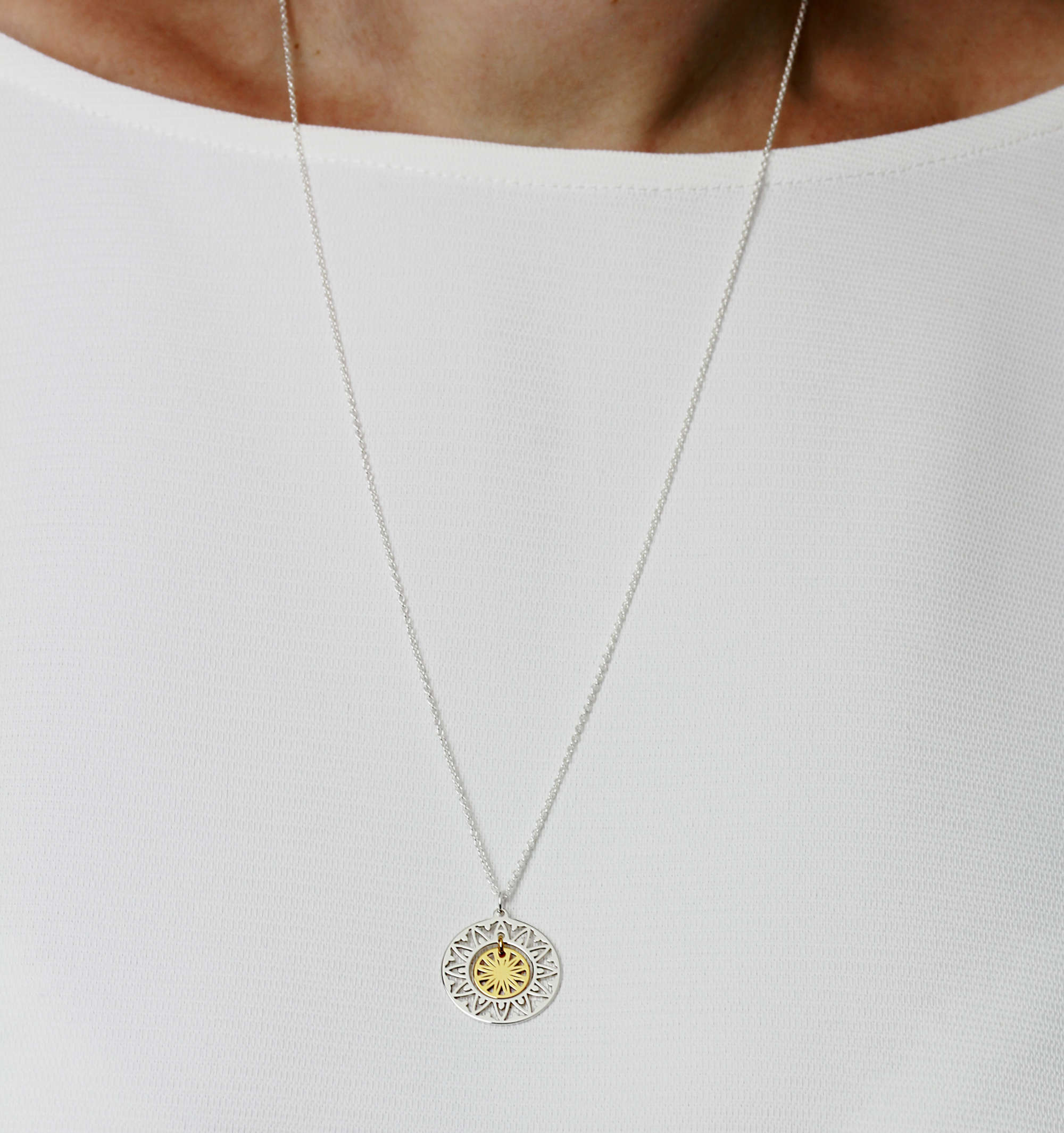 Eine Anhängerkette mit einem Sonnensymbol aus zwei Elementen. Ein sehr fein verarbeiteter Kettenanhänger mit einer starken Symbolik. Die innere Sonnenscheibe ist vergoldet.