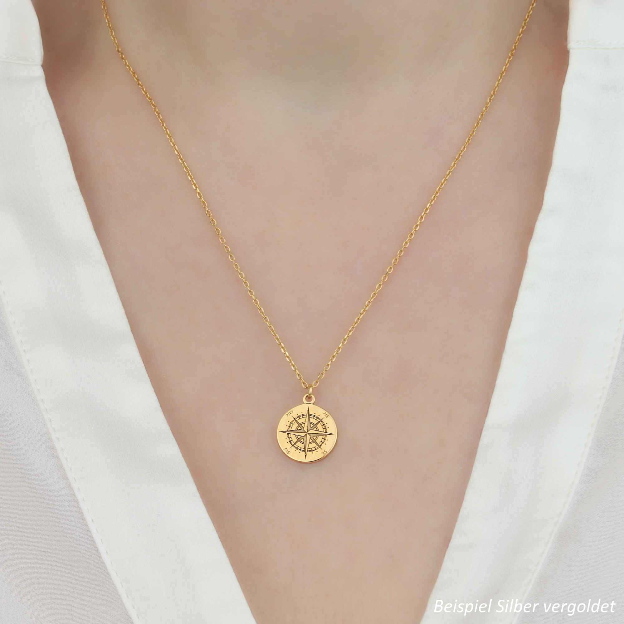 Kette mit einem Kompass-Anhänger aus 925 Silber vergoldet. Die Windrose ist graviert und kommt sehr schön im Kontrast mit dem Silber-Plättchen heraus.