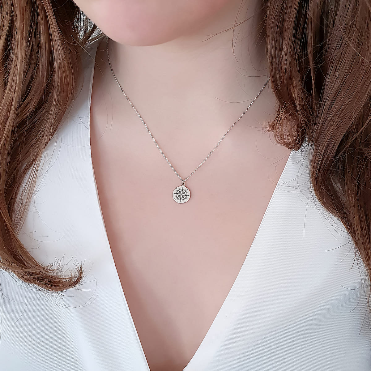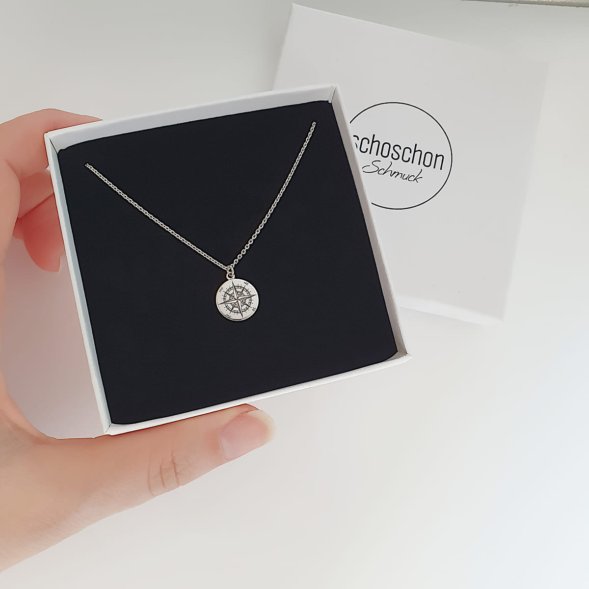 Kette mit einem Kompass-Anhänger aus 925 Silber. Die Windrose ist graviert und kommt sehr schön im Kontrast mit dem Silber-Plättchen heraus.