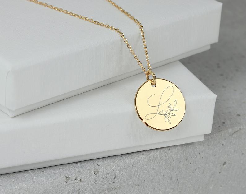 Eine feine Halskette aus 925 Silber vergoldet mit einem runden Gravur Anhänger, der mit einer zierlichen und eleganten Buchstabengravur ganz individuell verziert wird.