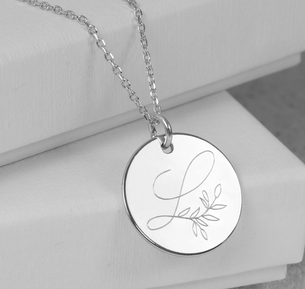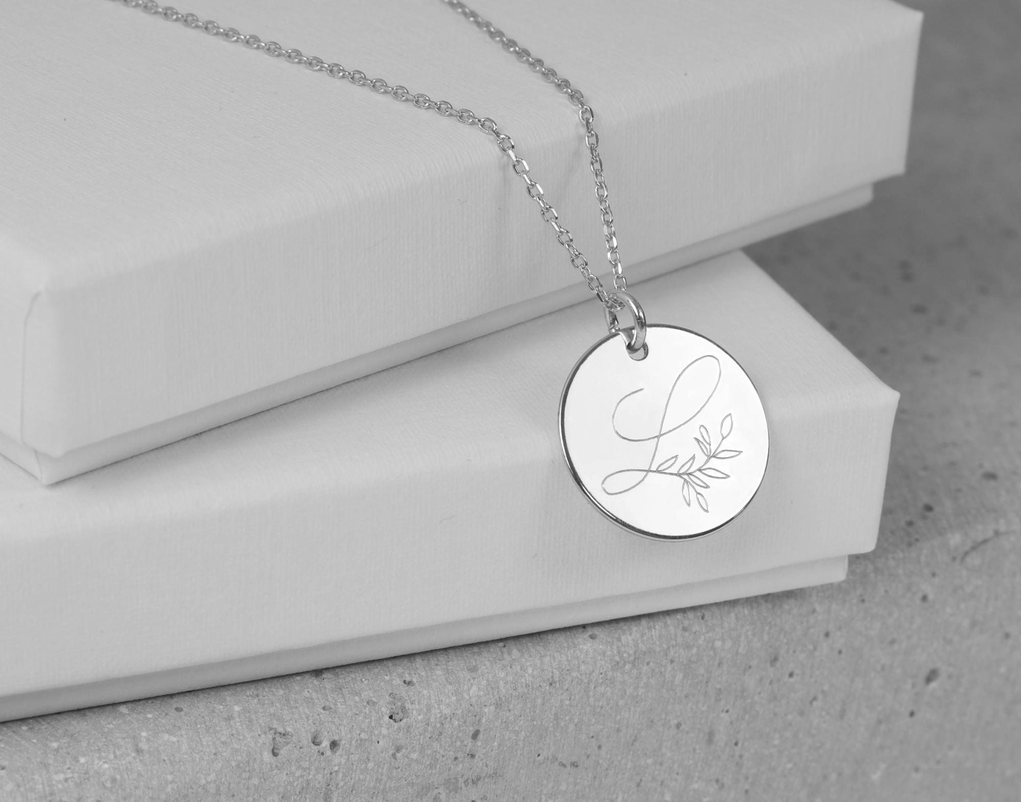Eine feine Halskette aus 925 Silber mit einem runden Gravur-Anhänger, der mit einer zierlichen und eleganten Buchstabengravur ganz individuell verziert wird.