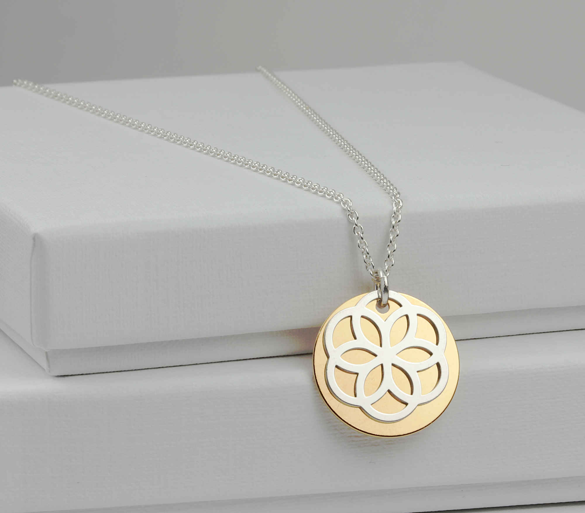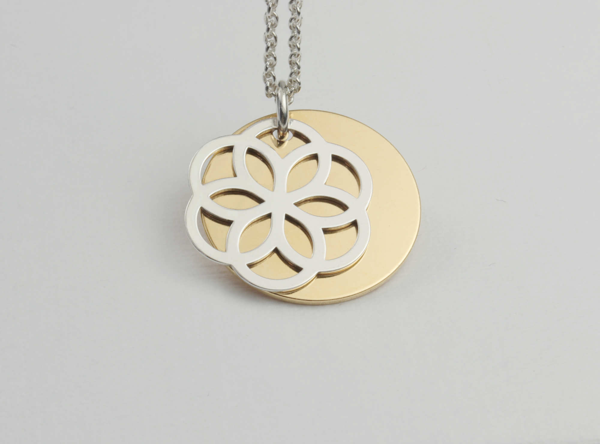 Die Harmonie der Blume des Lebens, mit den 6 gleich groß und miteinander verbundenen Kreisen, wird durch den Kontrast zwischen Gold und Silber elegant zur Geltung gebracht.