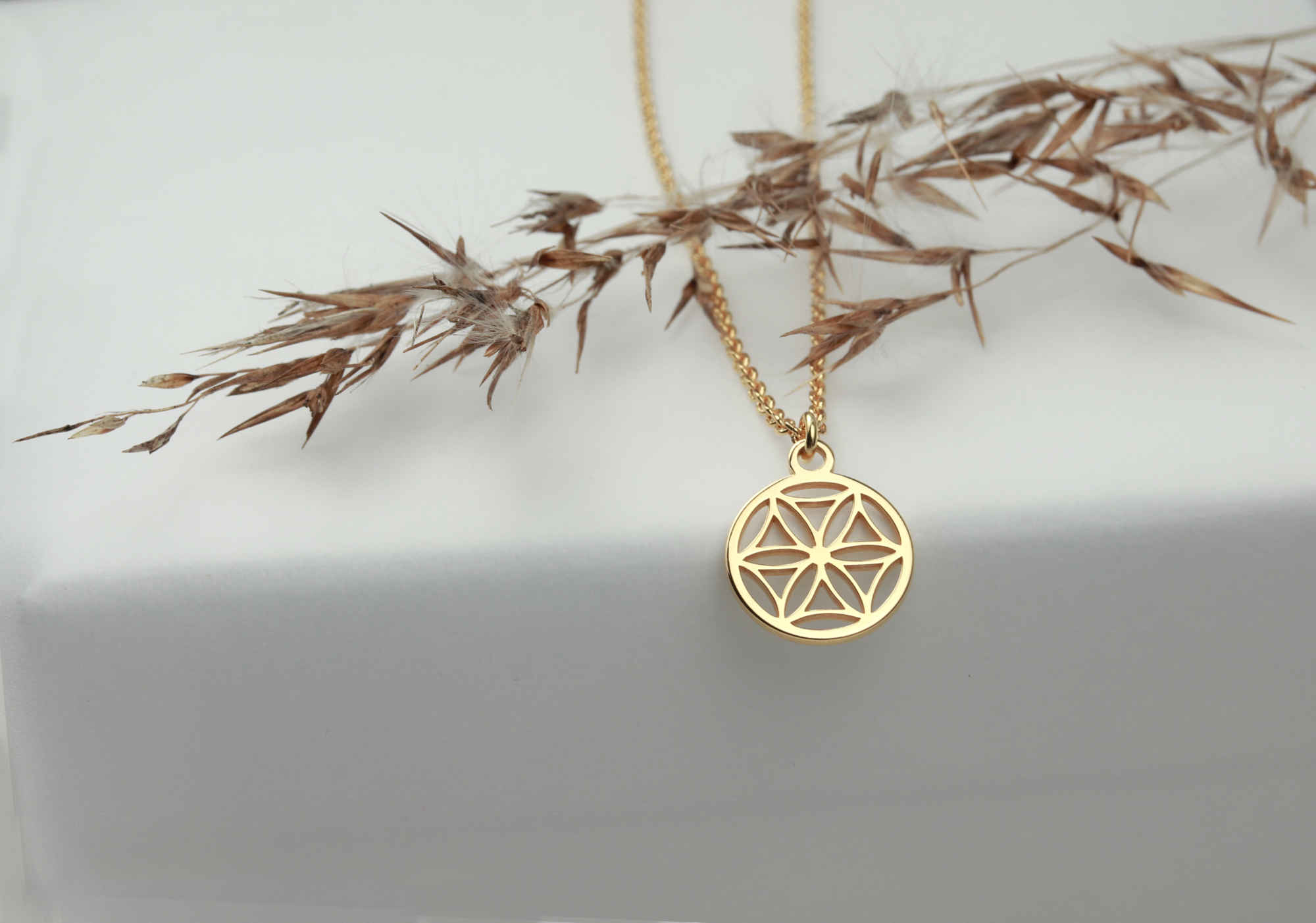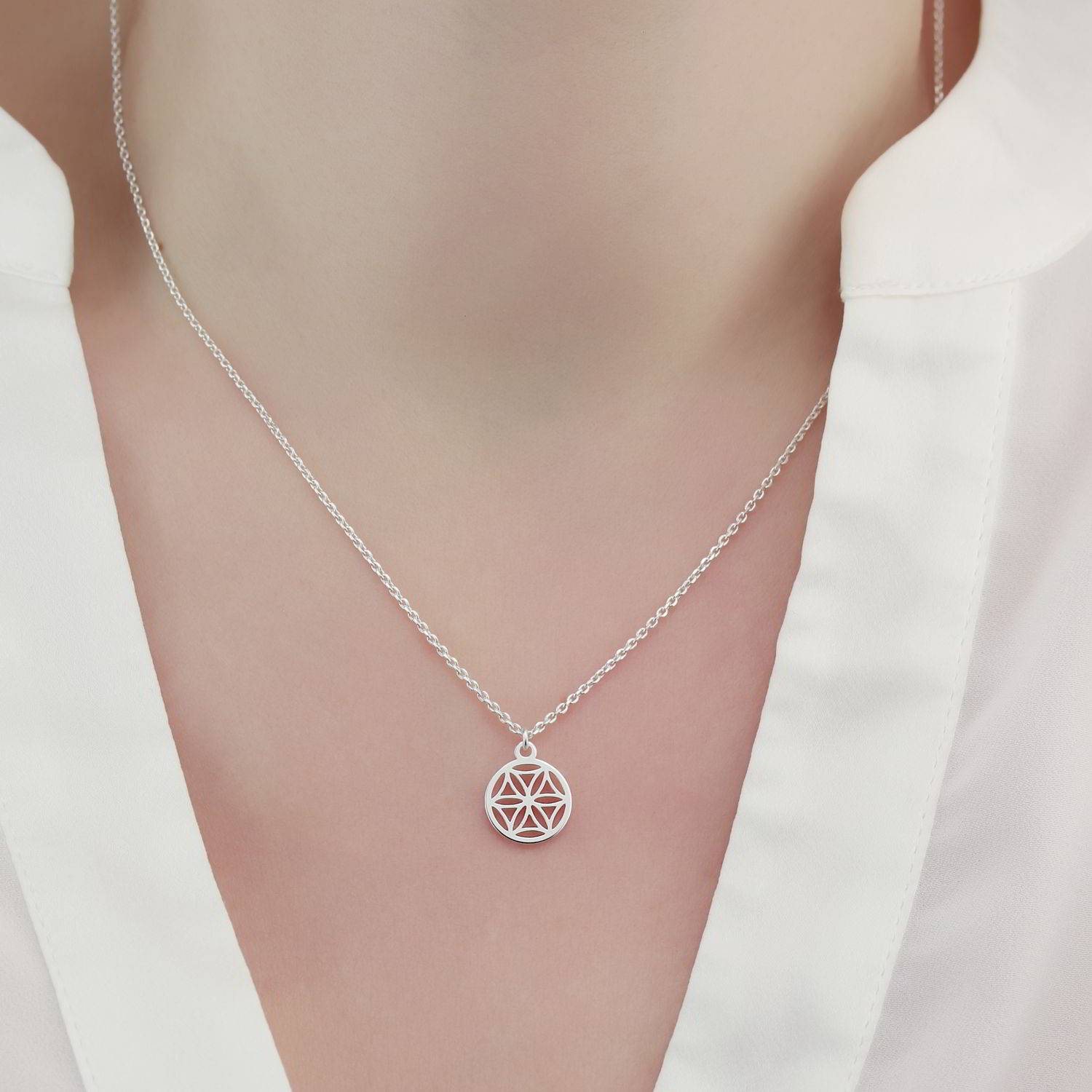 Eine zarte Kette mit einem filigranen Lebensblume-Anhänger aus 925 Silber. Der kleine Anhänger mit der Blume des Lebens hat ein Diameter von 10 mm.