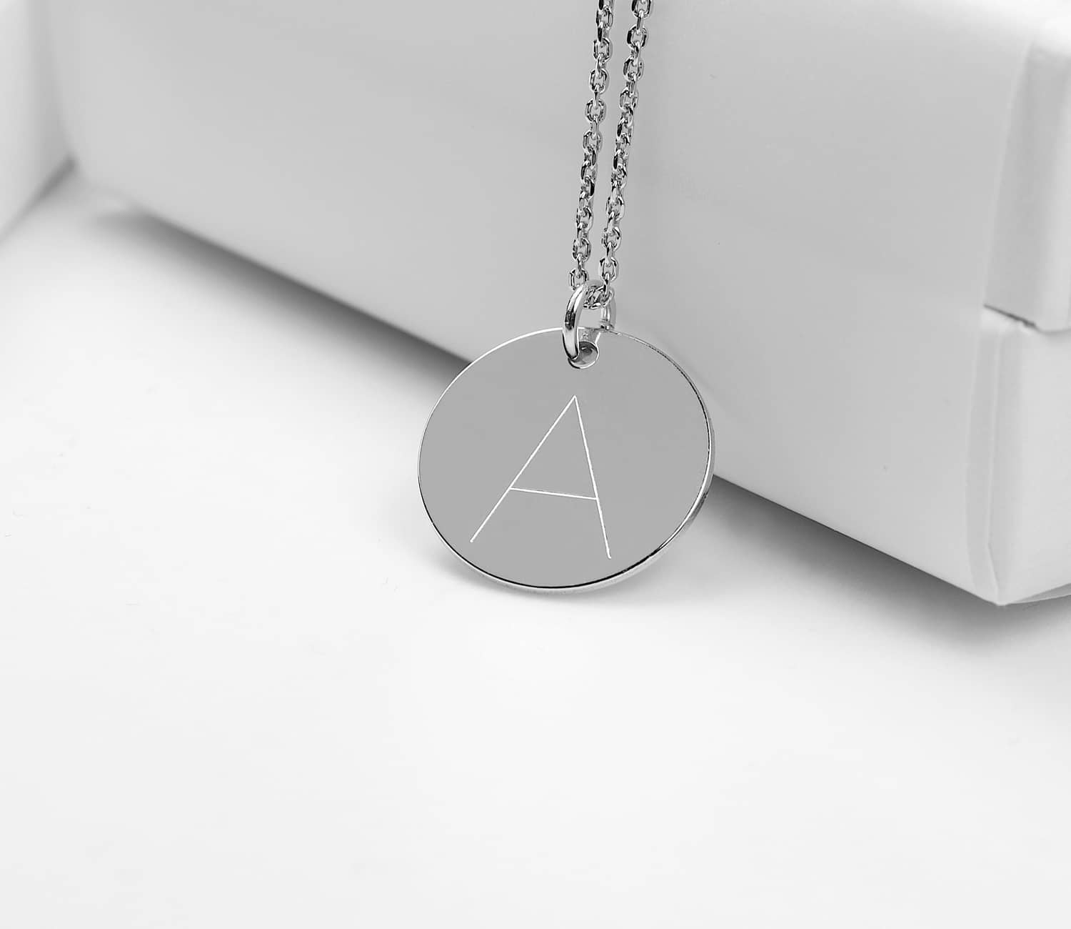 Eine zarte Kette mit einem runden Plättchen Anhänger auf der dein Wunsch-Initiale geziert wird.