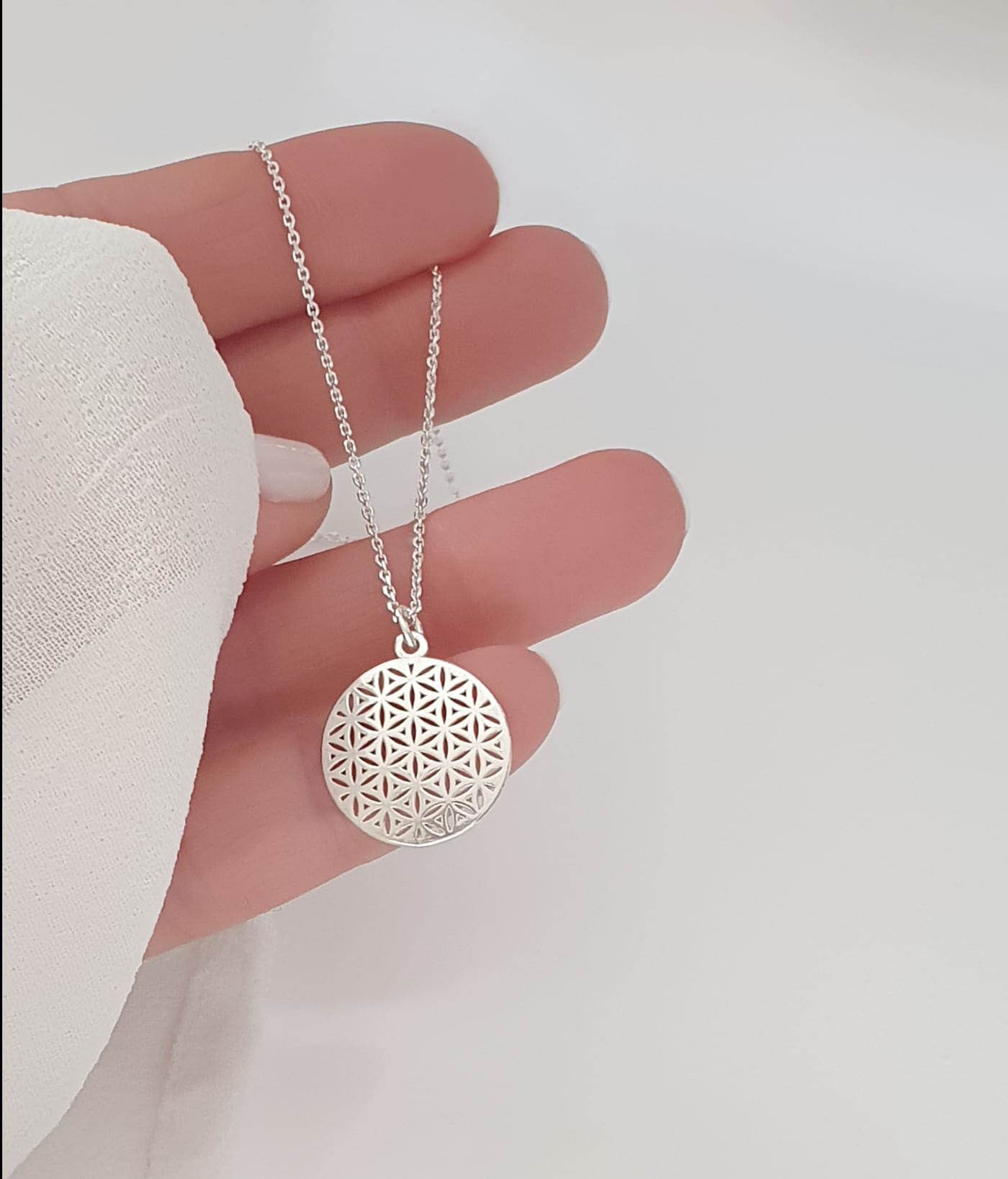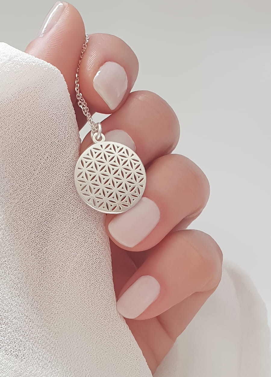 Eine 925 Silber filigrane Ankerkette mit dem beliebten Lebensblume-Anhänger. Der leicht konkave Anhänger bringt das blumige Design schön zur Geltung.