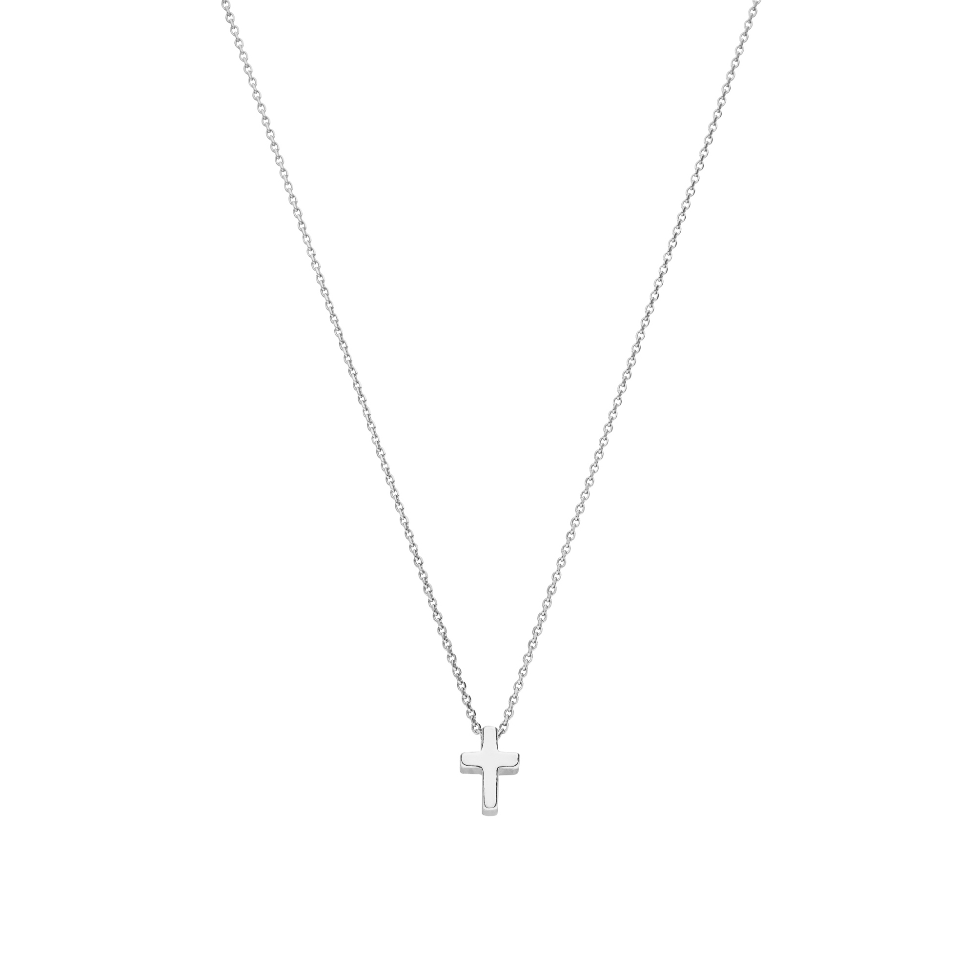 Eine feine 925 Silber rhodiniert Ankerkette geziert von einem schlichten Kreuz Anhänger. Ihr klassisches klares Design passt sich stilvoll an jeden Stil und Look an. Egal ob Alltags- oder Businessoutfit diese Kette ist ein geschmackvoll gewähltes Accessoire.