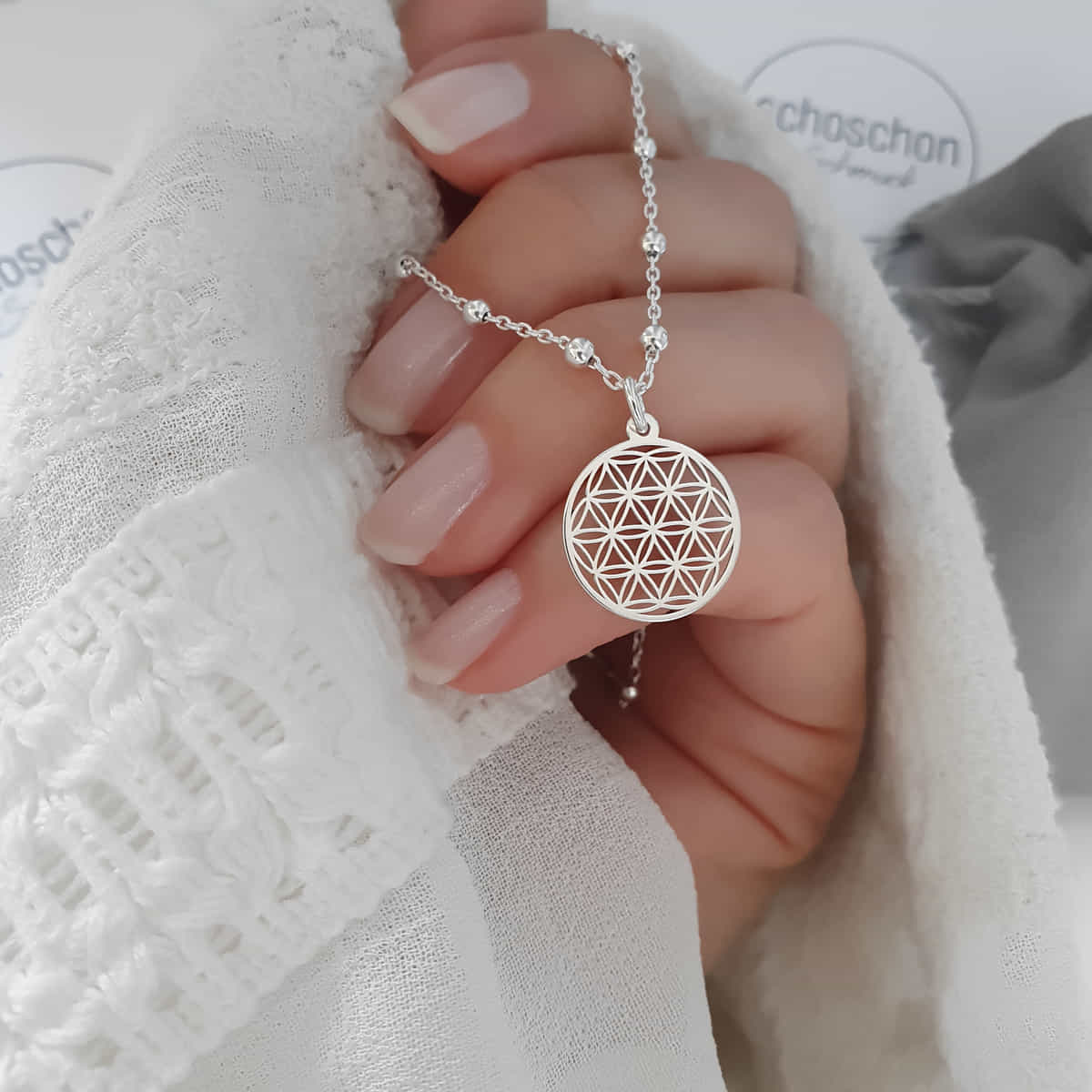 Eine zarte Kügelchen Halskette aus 925 Silber mit einem Lebensblume-Anhänger.