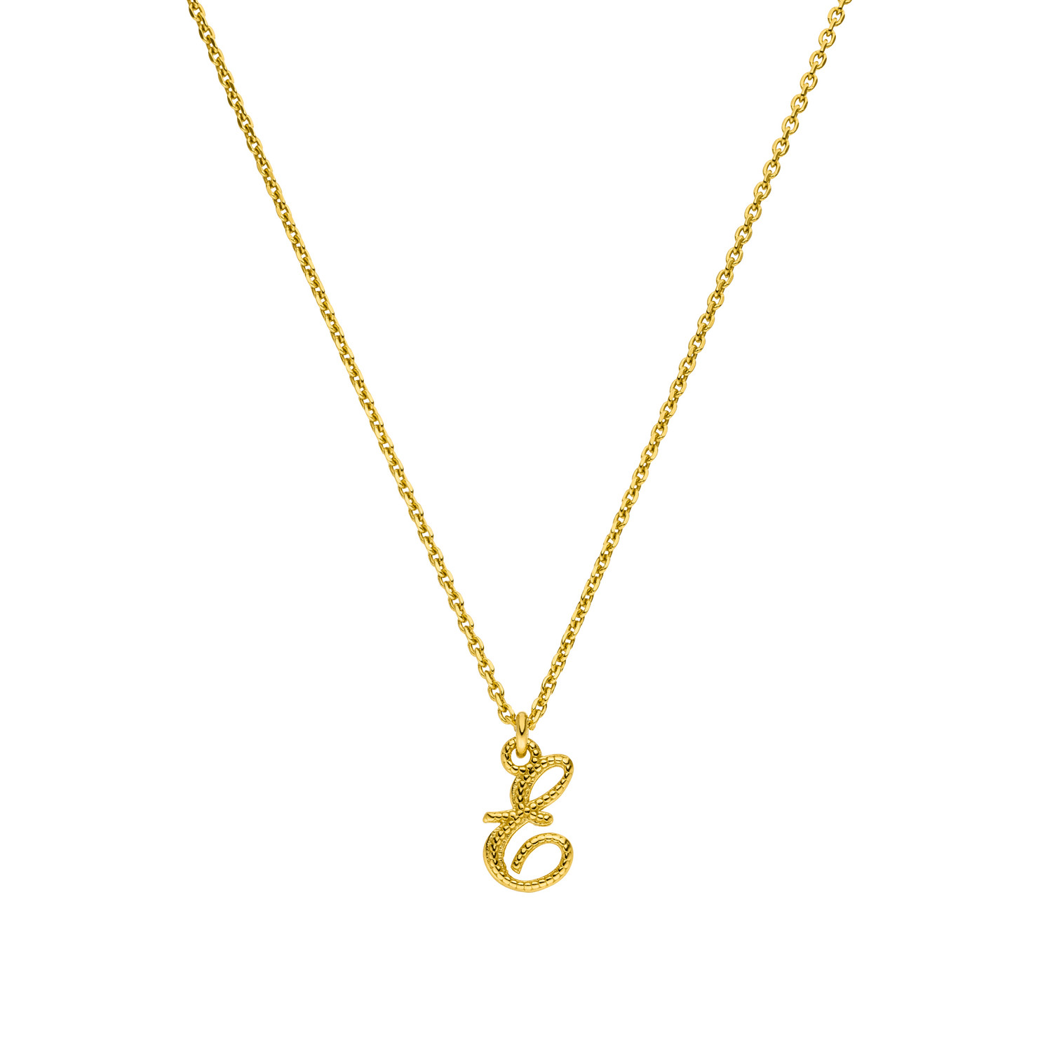 Eine feine Ankerkette mit filigranem geschwungenem Buchstaben-Anhänger aus 925 Silber vergoldet. Das Medaillon ist besetzt mit einer Reihe kleiner Kügelchen.