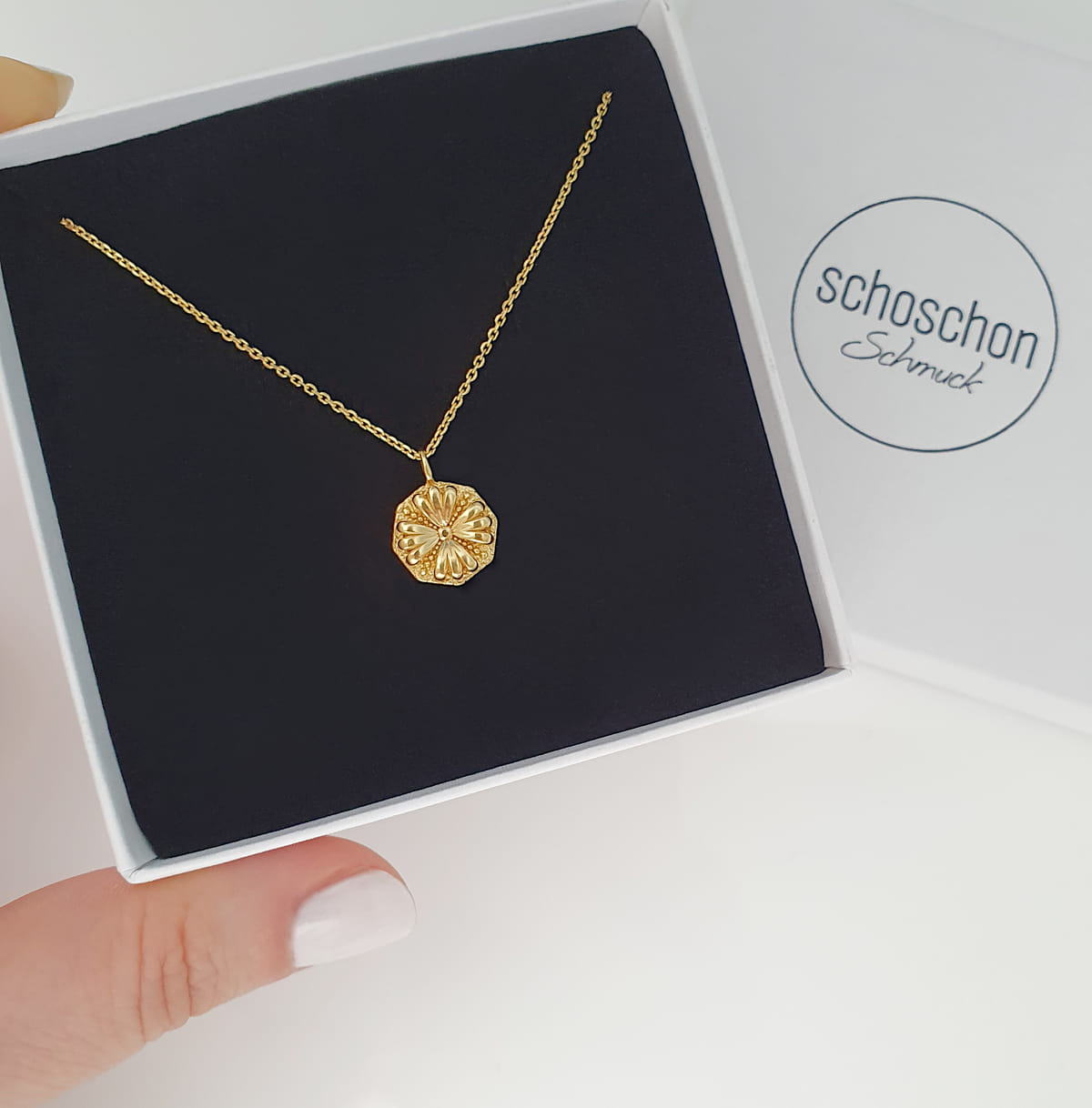 Filigrane Ankerkette aus 925 Silber vergoldet mit einem eleganten Blumenanhänger.