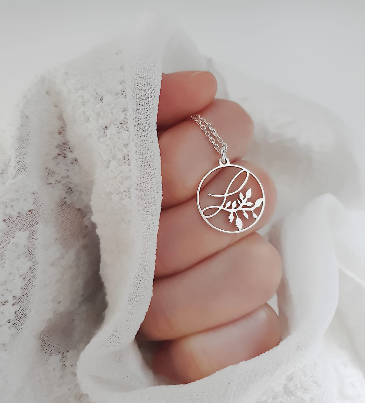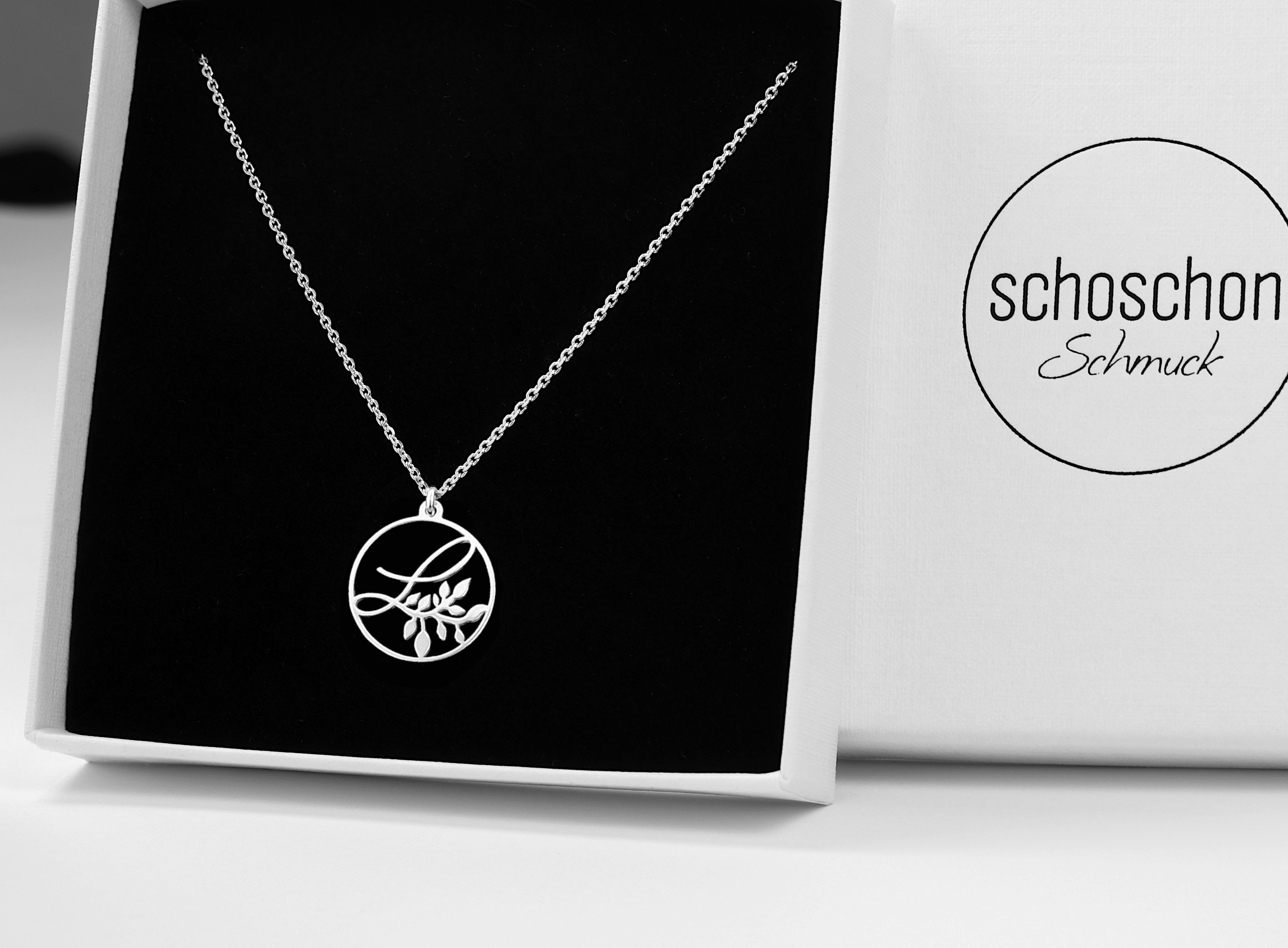 Eine feine Halskette aus 925 Silber mit einem runden Anhänger, der mit einem zierlichen und eleganten L - Buchstaben Blätterranke Design ganz individuell verziert wurde.