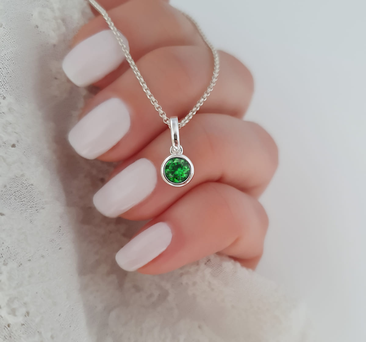 Eine zarte Rolo Halskette aus 925 Silber mit einem grünen Zirkon-Anhänger.