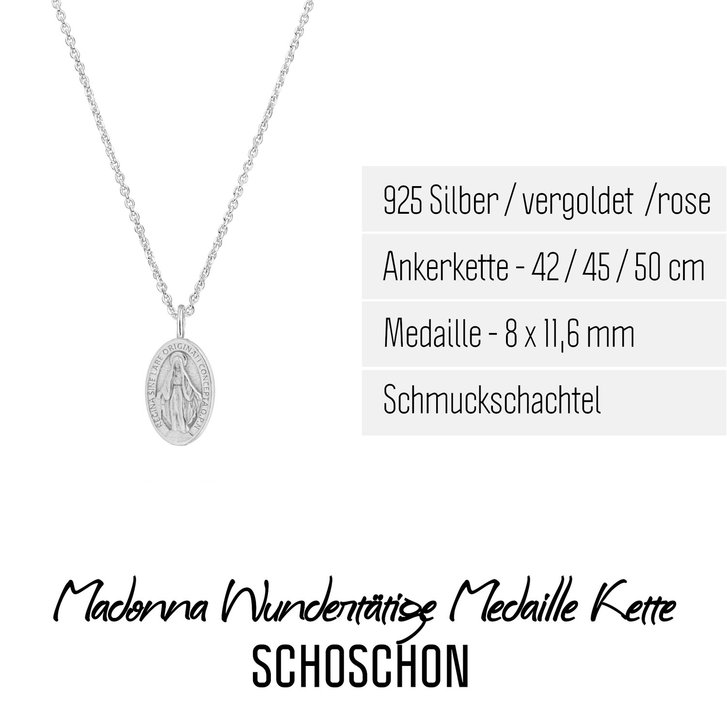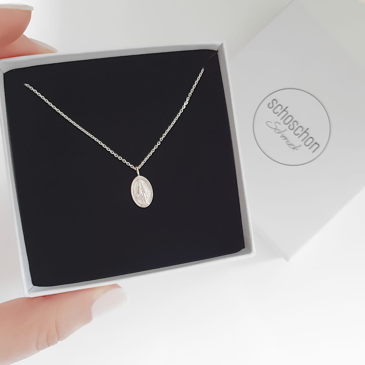 Eine schöne Halskette, die mit einem ovalen Anhänger aus hochwertigem 925er Silber verziert ist. Die Vorderseite des Anhängers präsentiert eine detaillierte Darstellung der Gottesmutter Maria, die mit feinen Details und kunstvoller Präzision gestaltet ist. Die Rückseite des zarten Anhängers ist geschmückt mit zwölf strahlenden Sternen, dem Buchstaben M, einem Kreuz sowie den symbolischen Herzen von Jesus und Maria.