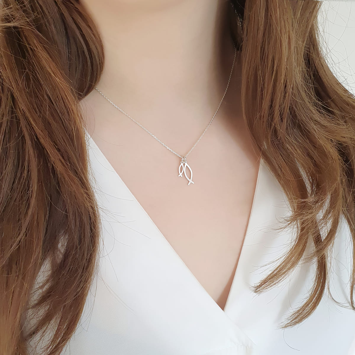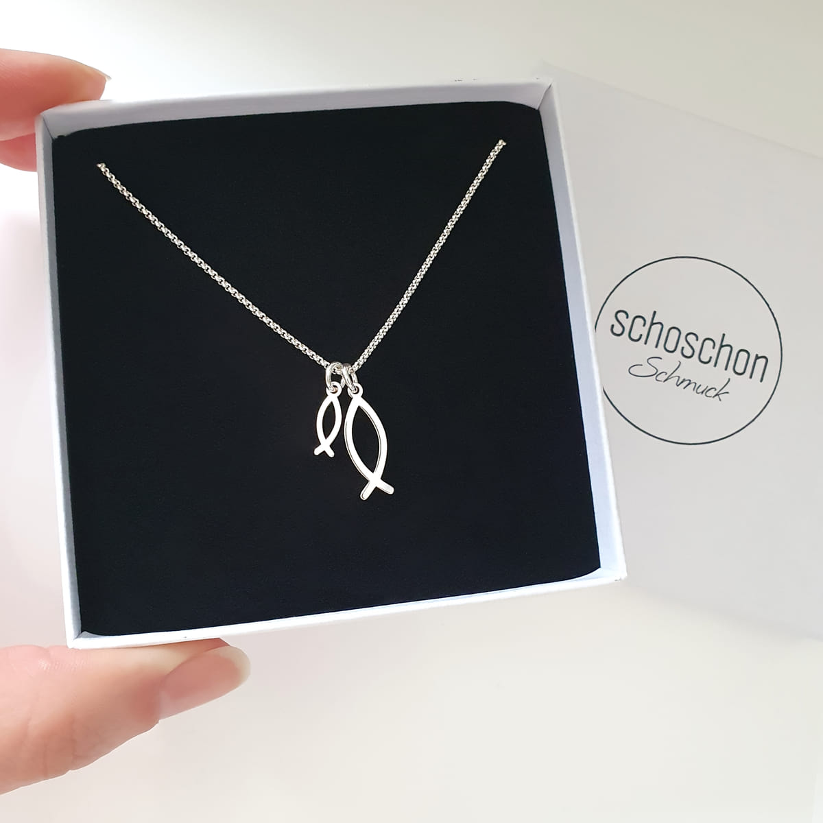 Diese wunderschöne Halskette aus 925er Silber eignet sich ideal als Geschenk zur Konfirmation. Verziert mit zwei ikonischen Ichthys-Symbol-Anhängern, die seit Jahrhunderten eine bedeutende Rolle im christlichen Glauben spielen, präsentiert die Kette zwei zarten Fischen als Ausdruck von Glauben und Hingabe.