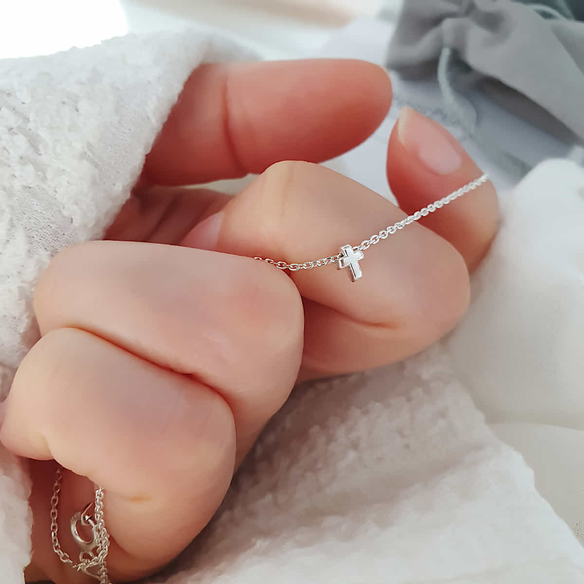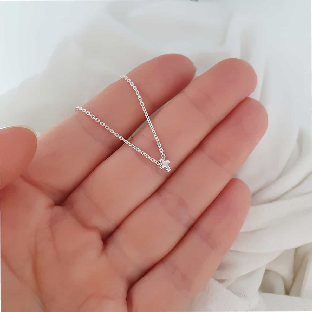Die filigrane Kette aus 925er Silber ist mit einem zarten Mini-Kreuzanhänger verziert.