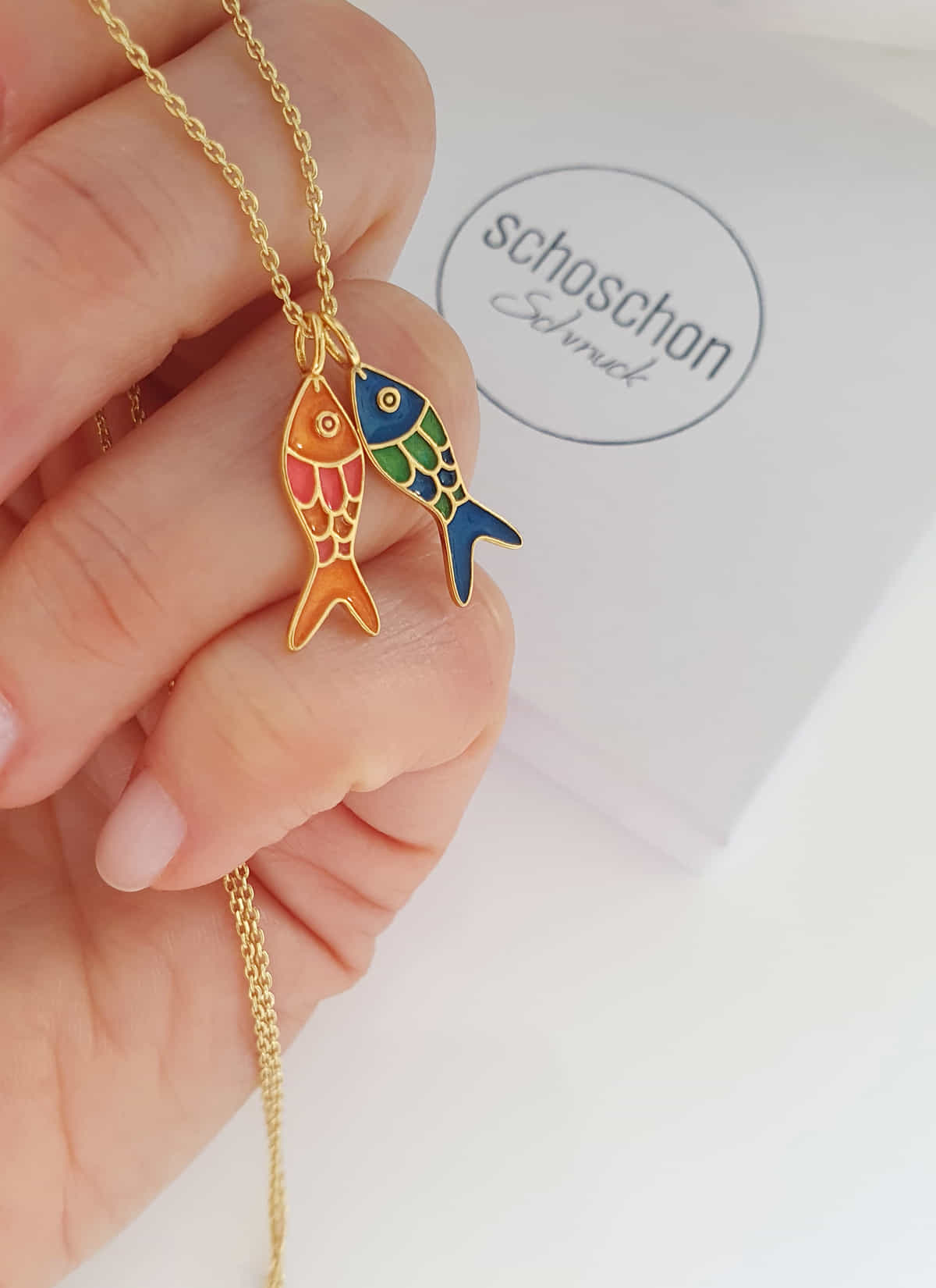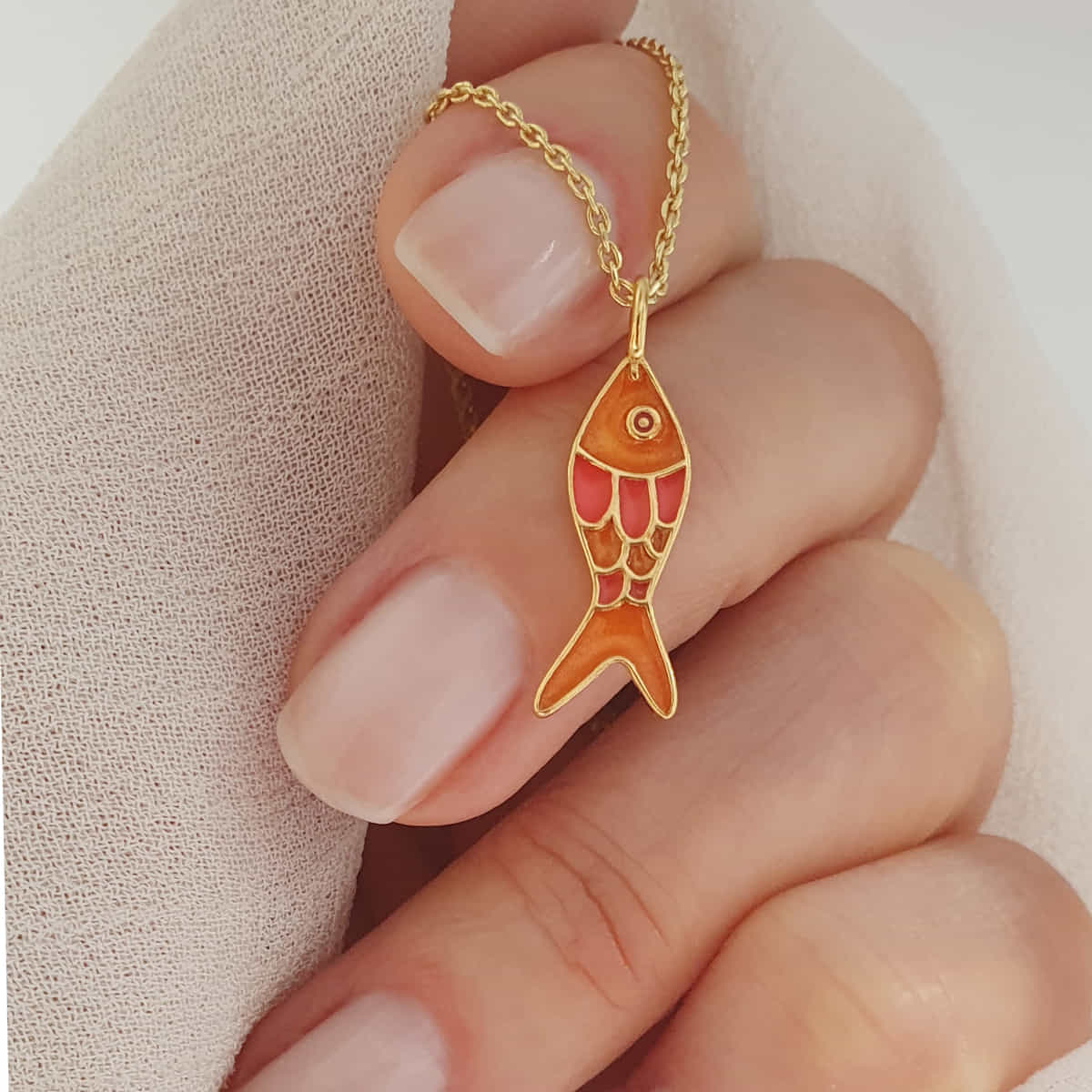 BUNTER MEERESZAUBER TO GO – Der Fisch-Anhänger aus 925er Silber mit Vergoldung und farbenfroher Emaille in Orange und Rosa bringt maritime Frische in Ihren Schmuck-Alltag.