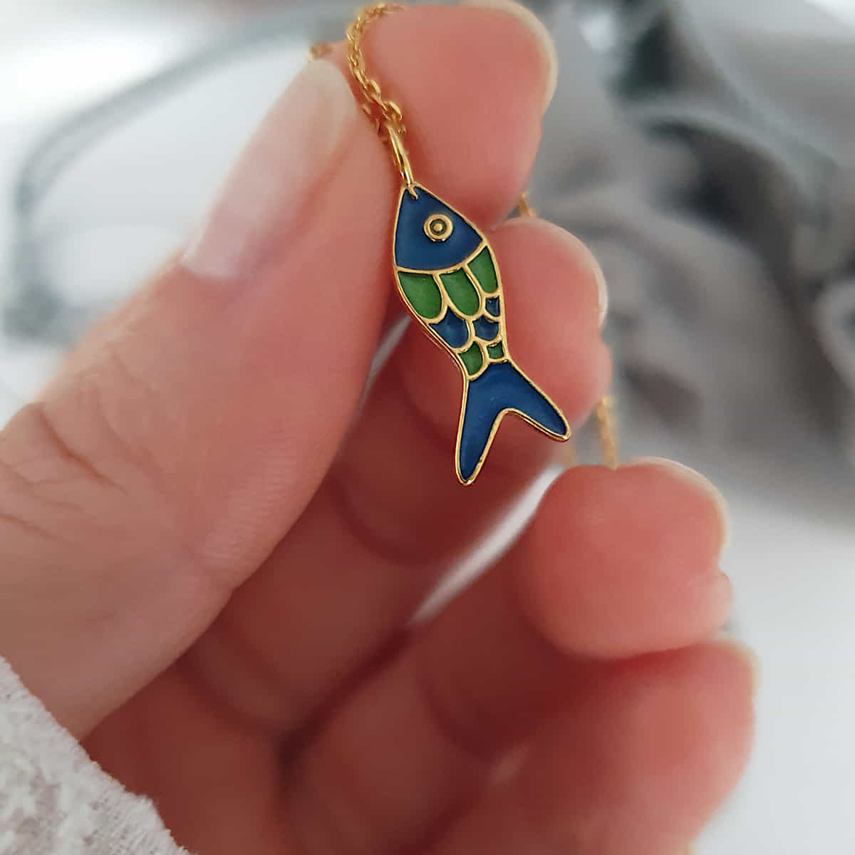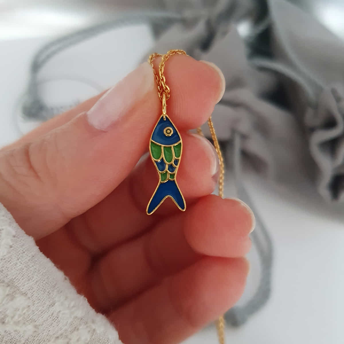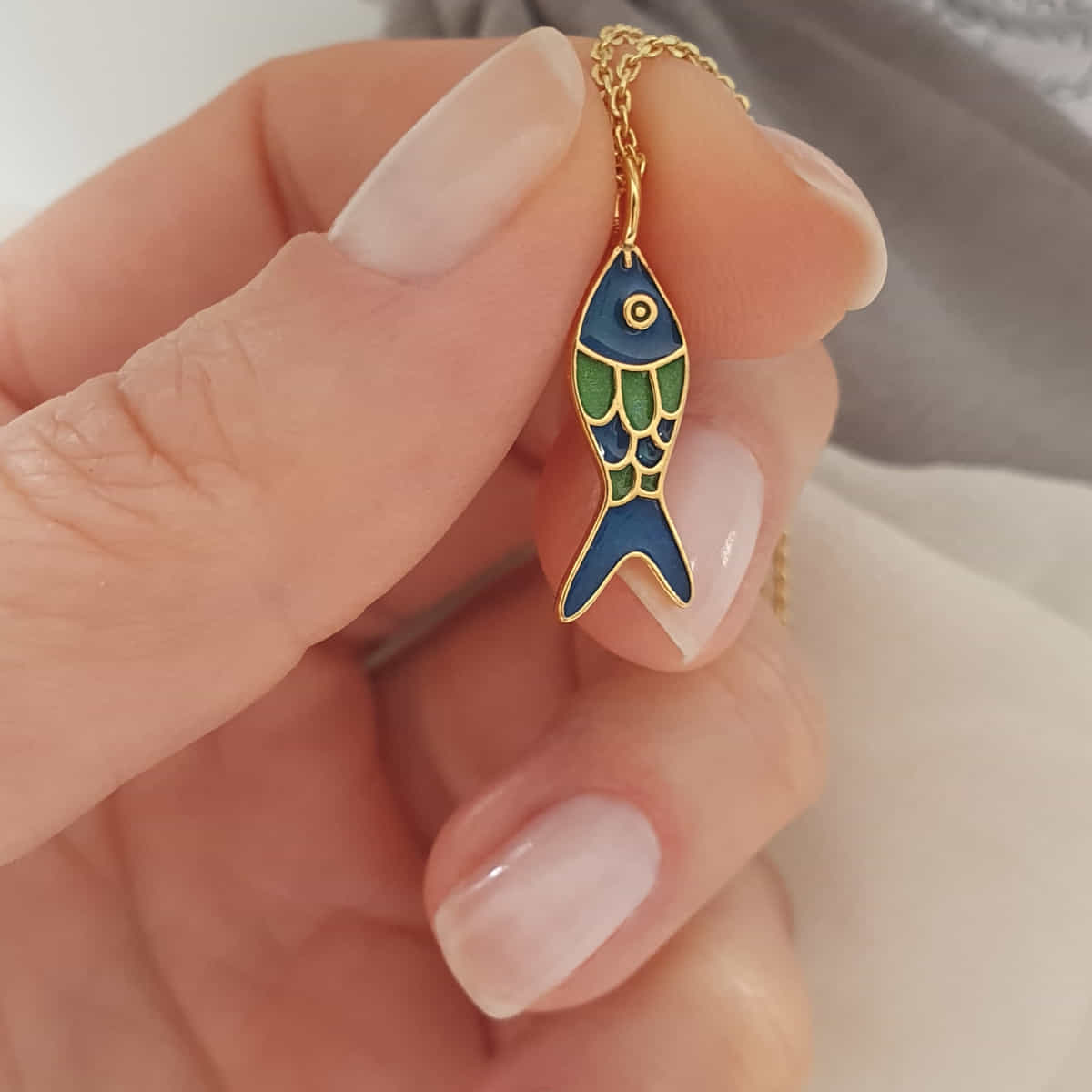 Gefertigt aus vergoldetem 925er Silber, beeindruckt das Medaillon durch ein detailreiches Fischmotiv, das mit hochwertiger Emaille in Grün und Blau veredelt ist. Die harmonischen Farben des Emaille betonen die Eleganz des Fischmotivs und verleihen dem Anhänger eine maritime und zugleich moderne Ausstrahlung. Für alle, die das Außergewöhnliche schätzen und sich gerne von einem Schmuckstück inspirieren lassen: Dieser Fisch symbolisiert Freiheit, Abenteuer und die verborgenen Tiefen des Meeres. Ein ideales Accessoire für alle im Sternzeichen Fische, die Individualität lieben und ein Gespür für das Besondere haben.